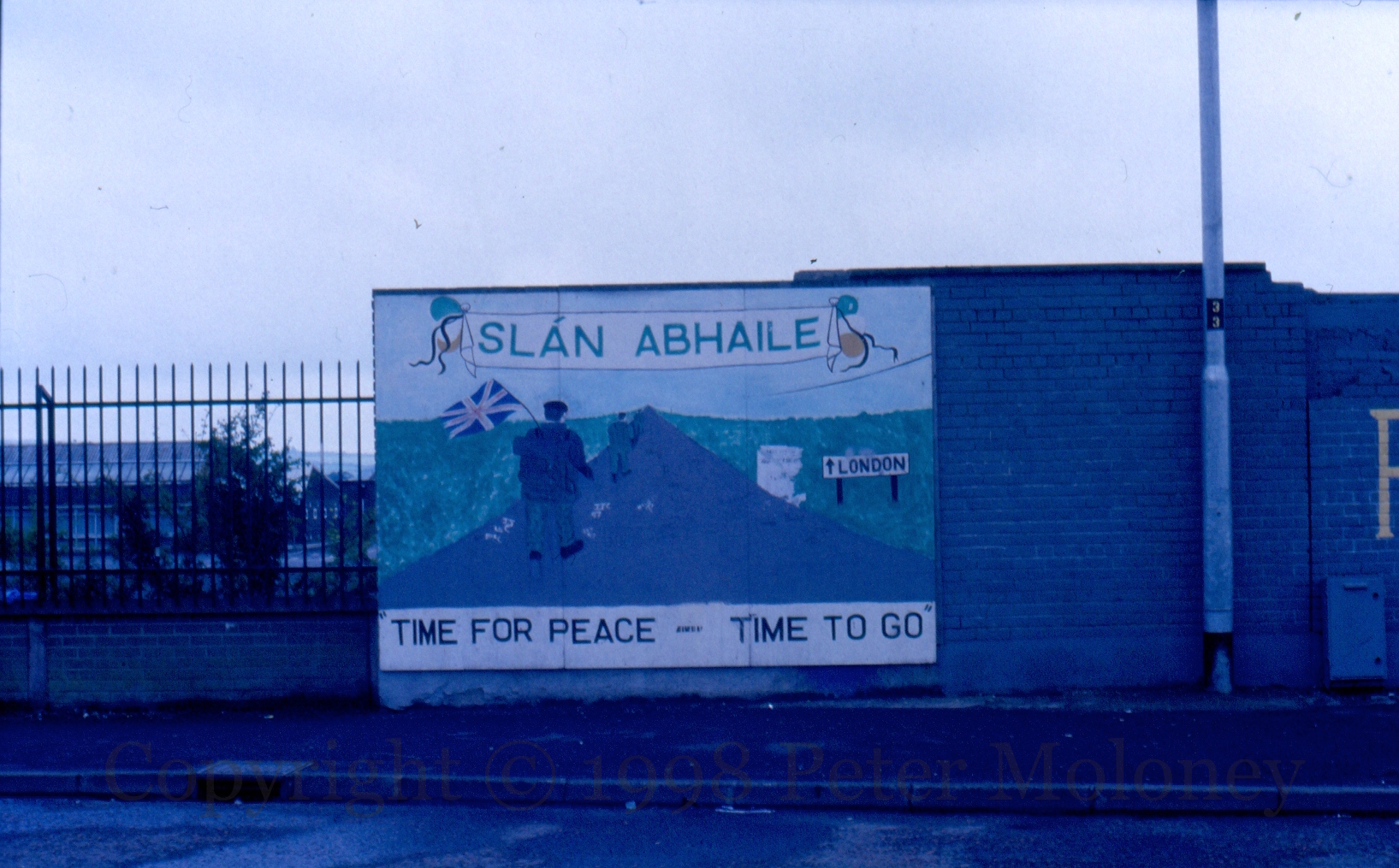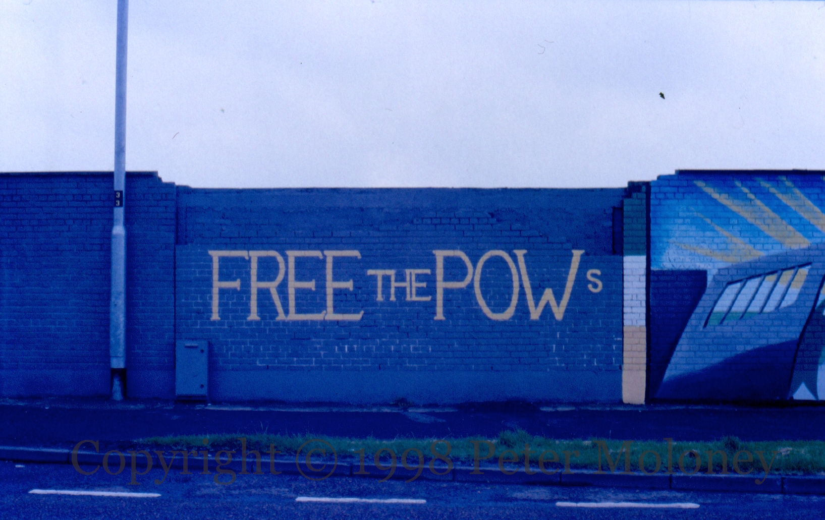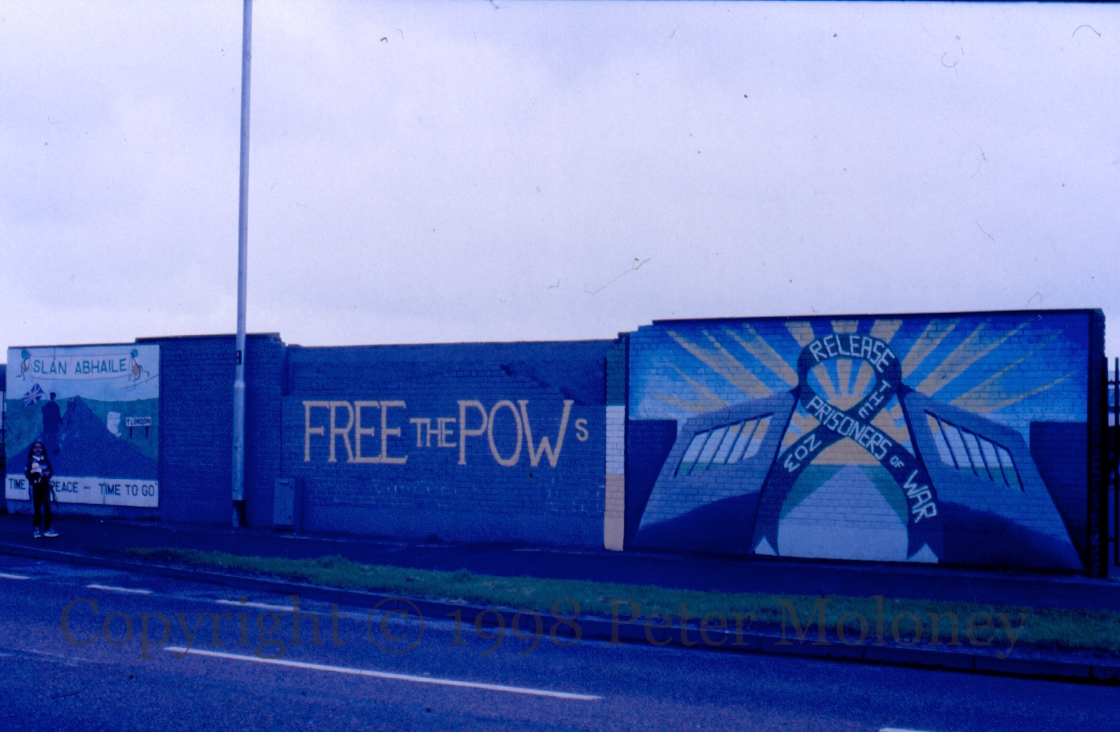 Three in a row, and a wide shot, from Racecourse Road, Derry. Two for the green ribbon campaign to release republican POWs – the ribbon itself is bursting through prison gates in a blaze of sunshine – and the Slán Abhaıle mural previously seen in 1994.