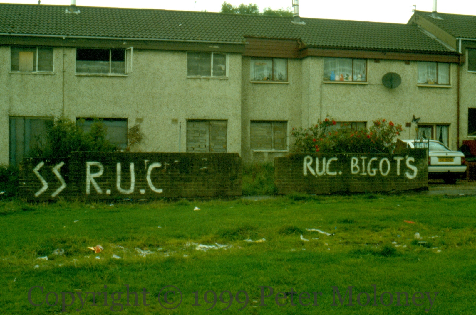 SS RUC 1999-01-032025-02-05Extramural Activity “SS RUC” and “RUC bigots”. unknown street, (Foylehill/Kildrum?), Derry Click image to enlargeCopyright © 1999 Peter MoloneyM02054 Share this: Share on X (Opens in new window) X Share on Facebook (Opens in new window) Facebook Like Loading... Related