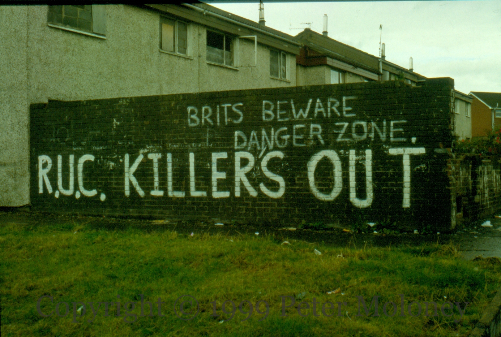 RUC Killers Out 1999-01-152025-02-05Extramural Activity “Brits beware – danger zone”, “RUC killers out”, and “RUC not welcome”. Beechmount Pass, Belfast. Click image to enlargeCopyright © 1999 Peter MoloneyM02070 M02071 Share this: Click to share on X (Opens in new window) X Click to share on Facebook (Opens in new window) Facebook Like Loading... Related