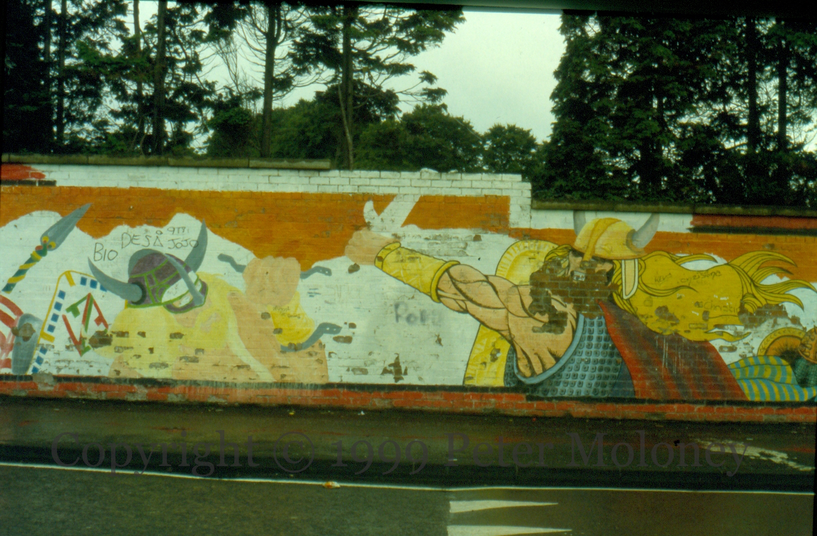 Nuada and the warrior of the Tuatha (perhaps fighting the Fir Bolg). Based on the work of Jim Fitzpatrick. Beechmount Avenue, Belfast.