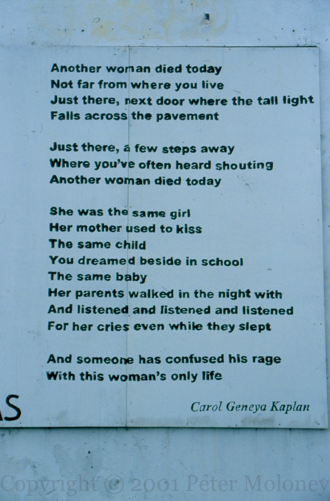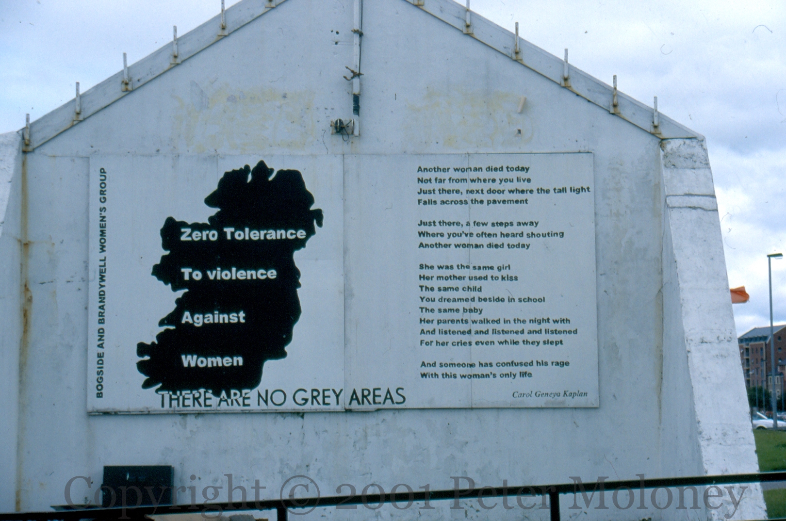 Board on the rear of Free Derry Corner from the Bogside And Brandywell Women’s Groups: “Zero tolerance to violence against women – there are no grey areas.” With some verses from Another Woman by Carol Geneya Kaplan.