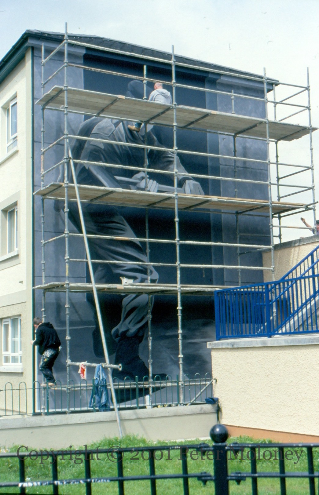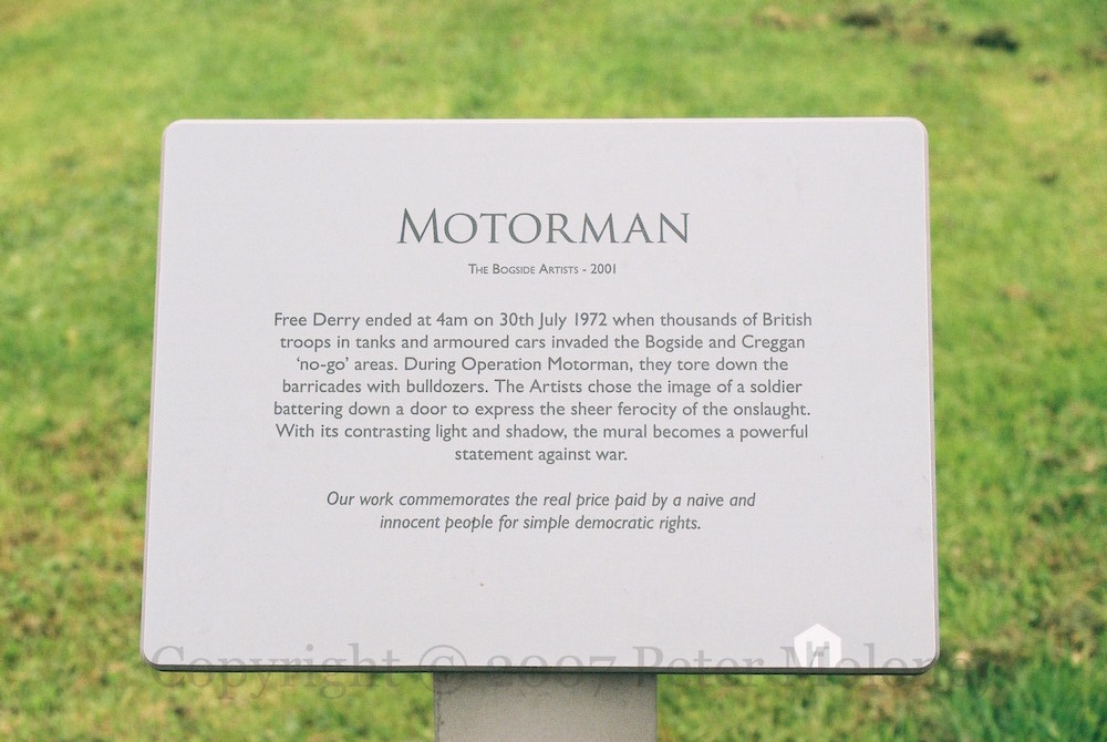 22,000 British soldiers were involved in retaking the “no-go” areas of Derry and Belfast in Operation Motorman, in July 1972. This is the seventh mural from the Bogside Artists in what would become The People’s Gallery. The plaque is from 2007.