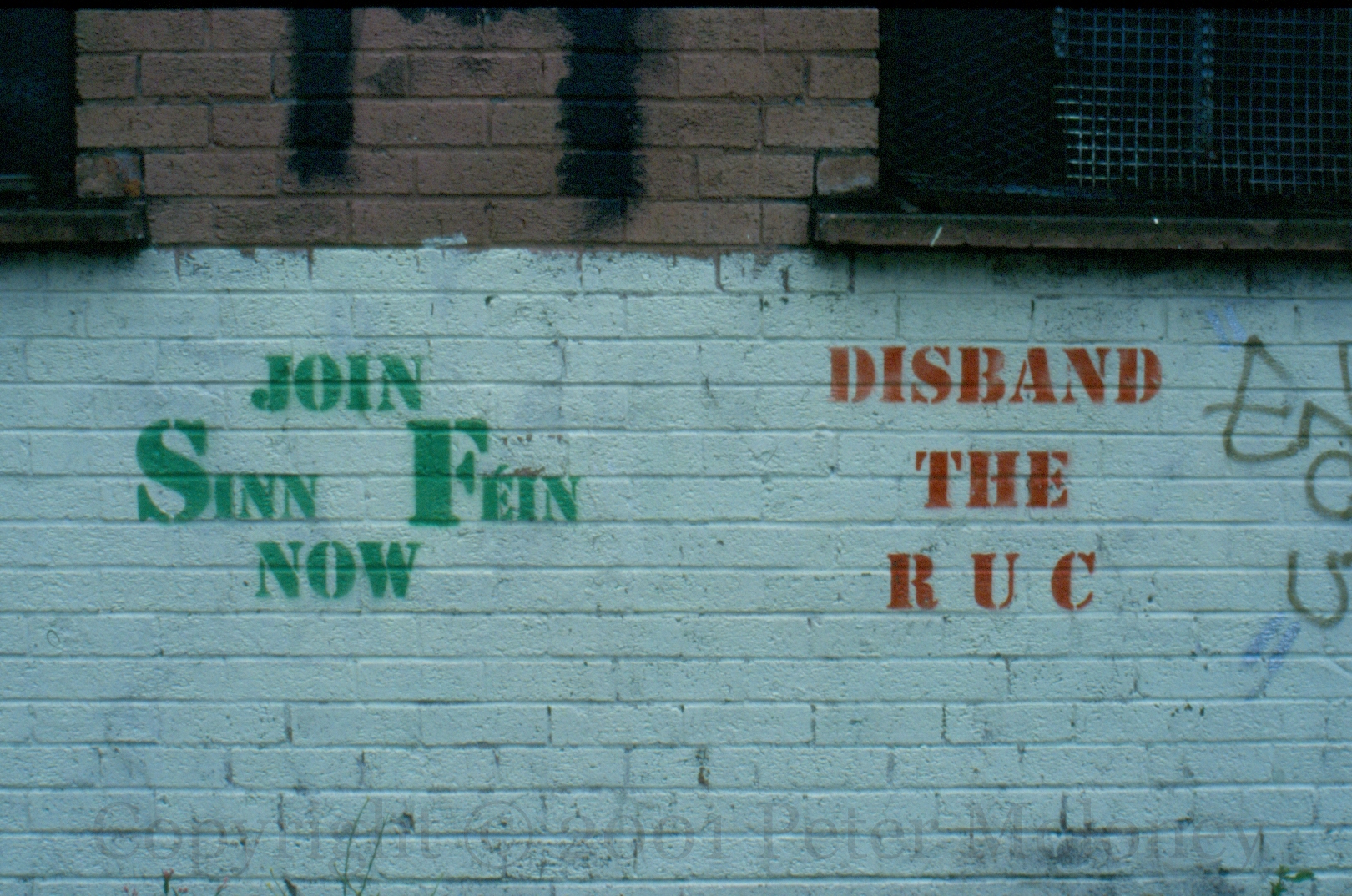 Join Sınn Féın Now 2001-02-102025-02-23Extramural Activity Stencils in Beechmount Avenue, Belfast: “Join Sınn Féın now” and “Disband the RUC”. Click image to enlargeCopyright © 2001 Peter MoloneyM01457 Share this: Click to share on X (Opens in new window) X Click to share on Facebook (Opens in new window) Facebook Like Loading... Related