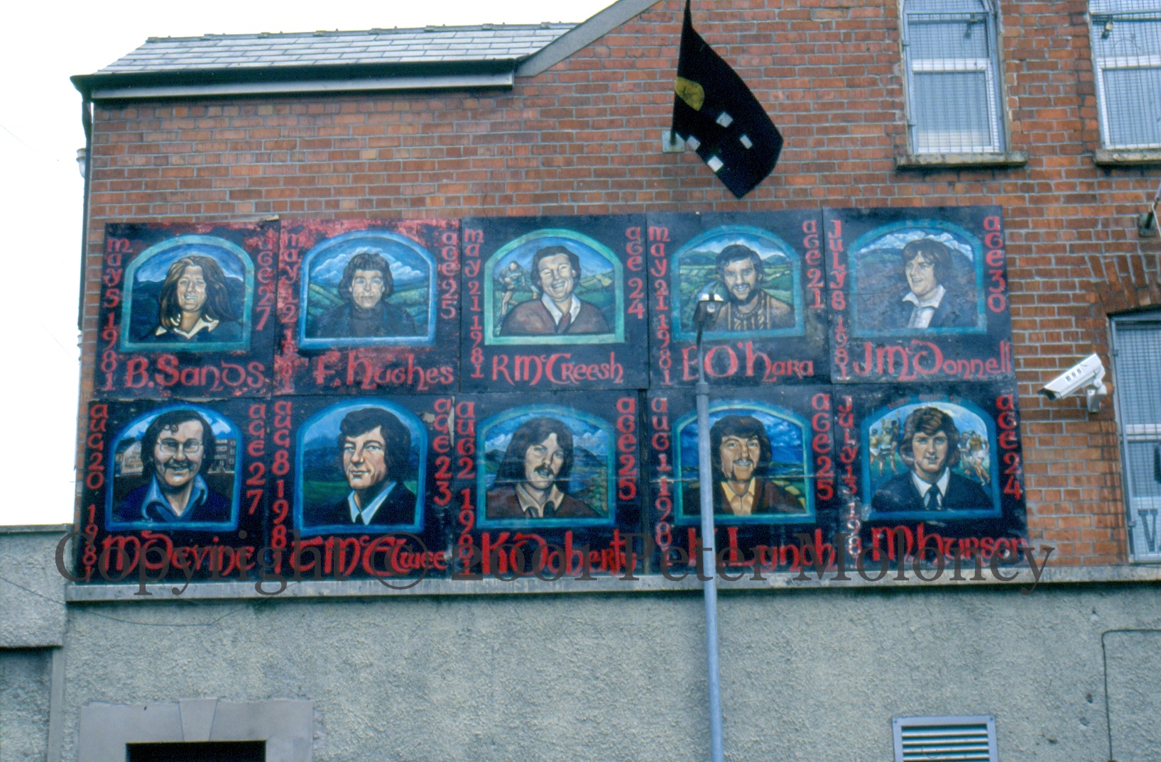 Portraits (along with ages and dates of death) of the ten deceased 1981 hunger strikers against backgrounds of their home areas. Mickey Devine, for example, is shown in front of Free Derry Corner while Martin Hurson is at a football game.