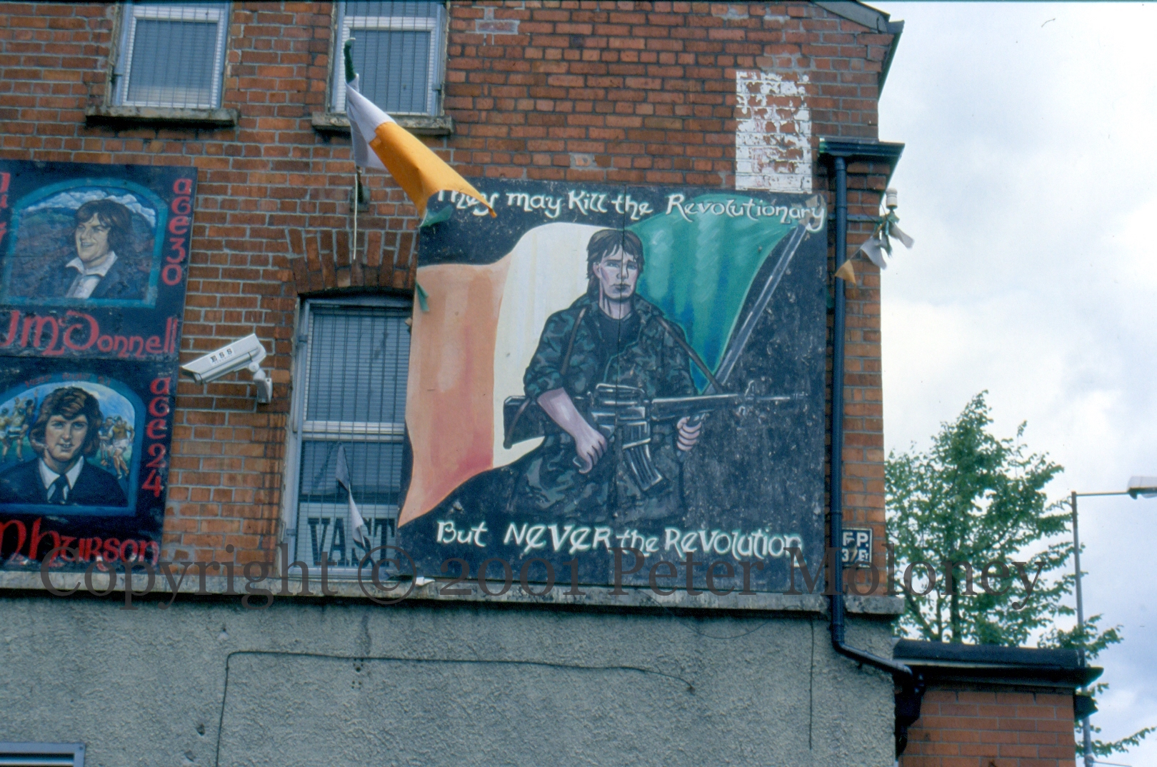“They may kill the revolutionary, but never the revolution.” The phrase is attributed to Black Panther leader Fred Hampton. Republican volunteer with AK in front of a Tricolour. Rockmore Road, Belfast. Seen previously in 1999.