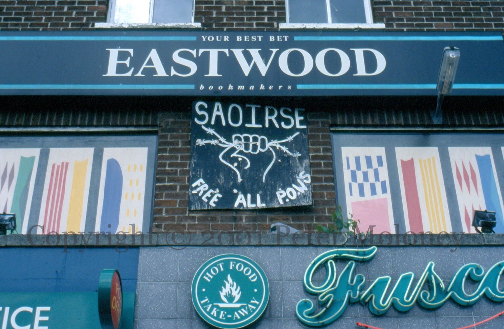 Saoırse 2001-02-232025-02-23Extramural Activity A fist clenched two strands of barbed wire. “Saoırse [freedom] – Free all POWs”. Andersonstown Road, west Belfast Click image to enlargeCopyright © 2001 Peter MoloneyM01472 Share this: Click to share on X (Opens in new window) X Click to share on Facebook (Opens in new window) Facebook Like Loading... Related