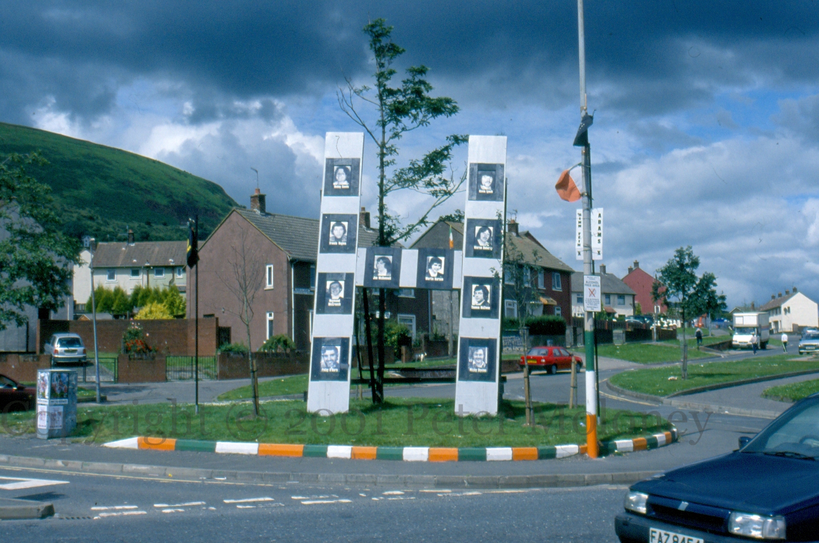 For the twentieth anniversary of the hunger strikes (1981-2001), a large H with portraits of the ten deceased strikers, plus Michael Gaughan and Frank Stagg.