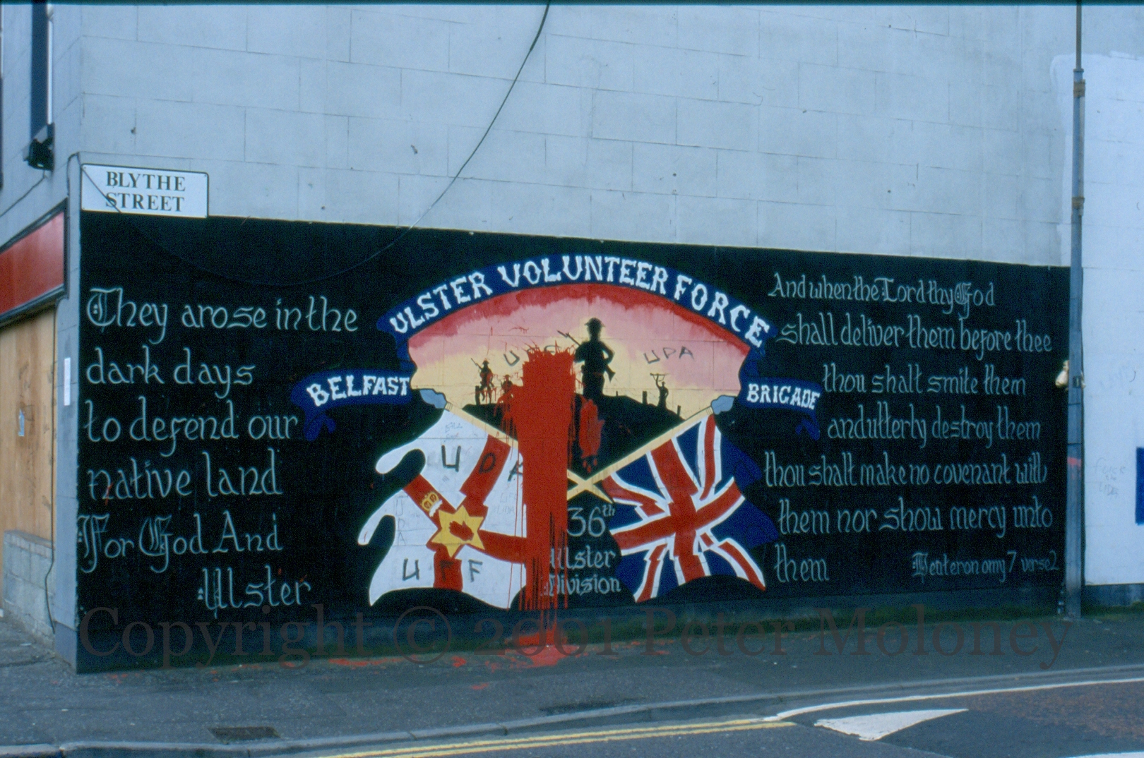 Paint-bombed mural to members of the Ulster Volunteer Force, Belfast Brigade, in the 36th (Ulster) Division, with (anachronistic) Ulster Banner and Union Flag: “they arose in the dark days to defend our native land for God and Ulster”, “And when the Lord thy God shall deliver them before thee, though shalt smite them and utterly destroy them, thou shalt make no covenant with them nor show mercy unto them – Deuteronomy 7 verse 2”.