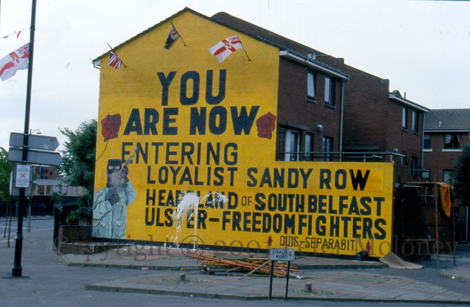 A hooded gunman welcomes you to “loyalist Sandy Row, heartland of South Belfast Ulster Freedom Fighters. Quis separabit.” The wording is perhaps an imitation of Free Derry Corner.
