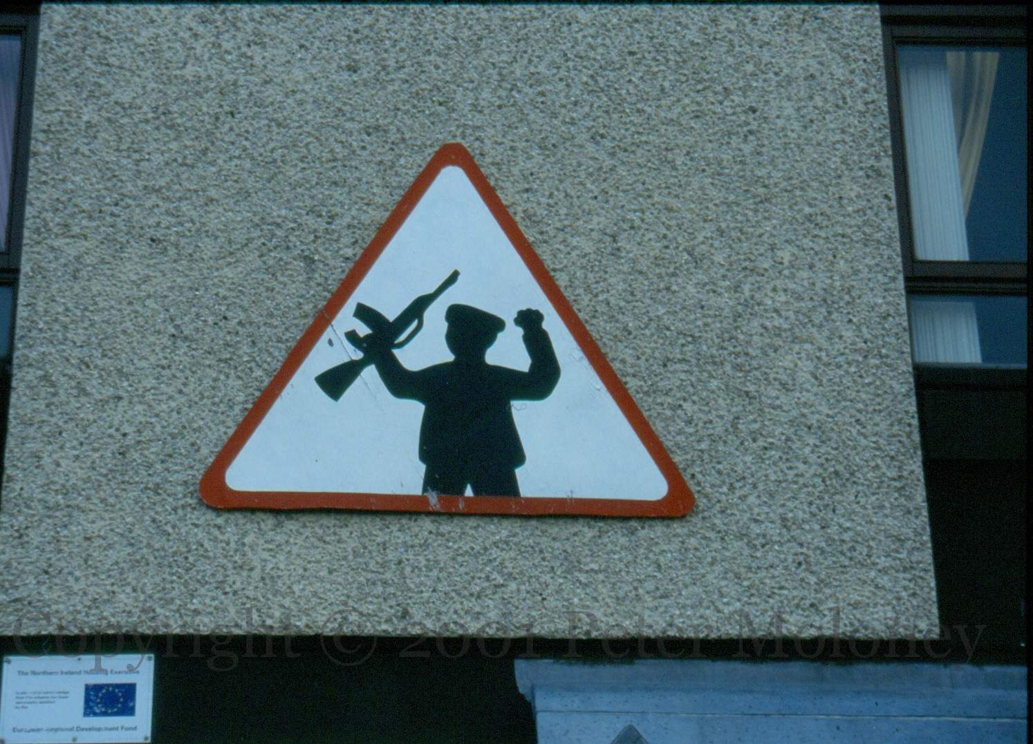 The Housing Executive/European Regional Development Fund plaque is presumably not for this “road sign” of the celebrating sniper! See previously: Free Derry Corner 1996 | The Boys Are Back.
