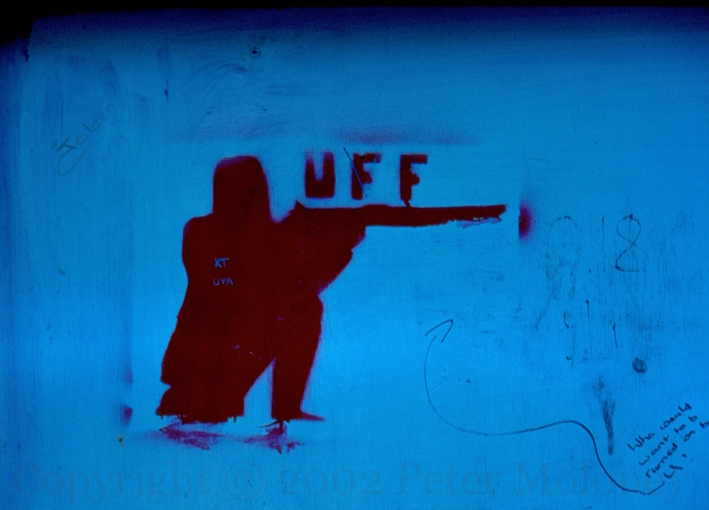 Shadow Of A UFF Gunman 2002-01-062025-02-24Extramural Activity Stencil of a UFF volunteer in kneeling position in Kennedy Place, Londonderry. With faded C-18 graffiti on the right. Click image to enlarge Copyright © 2002 Peter MoloneyM01566 Share this: Click to share on X (Opens in new window) X Click to share on Facebook (Opens in new window) Facebook Like Loading... Related