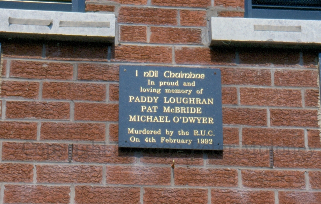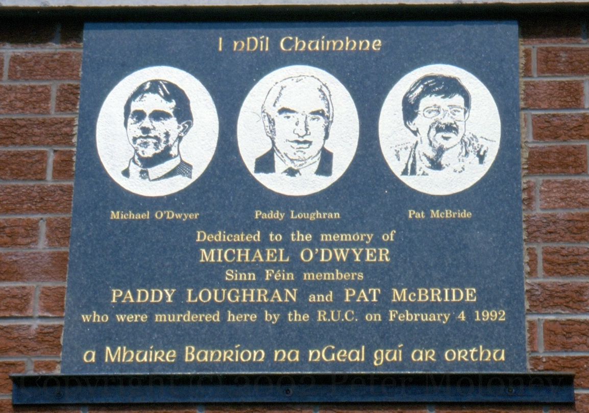 Three plaques above the Sınn Féın office on the Falls Road, Belfast, the first is to 1981 IRA hunger striker Pat “Beag” McKeown, who worked for Sınn Féın and was elected to Belfast City Council until dying in 1993. The other two are to Michael O’Dwyer, Paddy Loughran, and Pat McBride. O’Dwyer had stopped in to the office to register a complaint; Loughran and McBride were Sınn Féın members. All three were shot in February 1992 by RUC constable Alan Moore, who had been suspended the previous day for driving drunk after firing shots over the grave of a deceased colleague; after killing the SF men he drove to Lough Neagh and took his own life with a shotgun. (NYTimes | Independent | For a somewhat different take, see An Phoblacht)