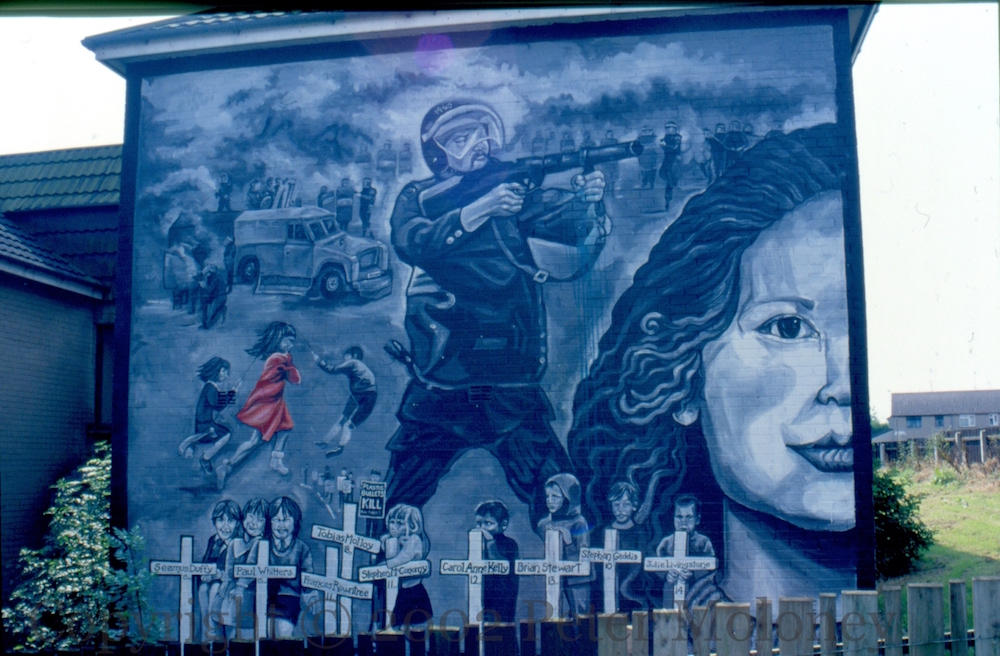 12-year-old Carol Ann Kelly was shot by the British Army on May 22nd, 1981, and died three days later. Eight other children are remembered in this mural: Tobias Molloy, Frances Rowntree, Seamus Duffy, Paul Whitters, Stephen McConomy, Brian Stewart, Stephan Geddis, and Julie Livingstone. Molloy and Rowntree were killed by rubber bullets, the rest by plastic bullets. The mural, by Andrea Redmond, is in Twinbrook Road, Dunmurry, near where Kelly was shot.