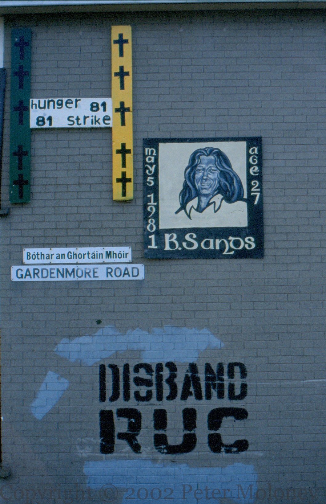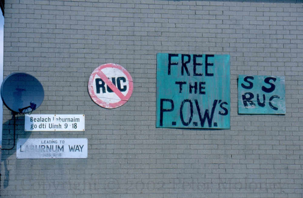 Here are two images of a variety of small boards in Gardenmore Road/Laburnum Way, Twinbrook, including three about the RUC, a tricoloured H-shaped board with ten crosses, and a portrait of Bobby Sands who lived in the building that the boards are on. (The portrait and the items in the second image date back to at least 1996. See C01012 and C01007.)