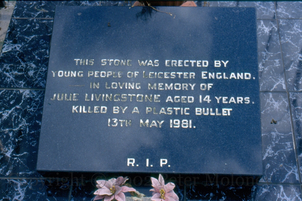 A week before Carol Ann Kelly was shot in Twinbrook, 14 year-old Julie Livingstone was also killed by a plastic bullet on May 13th, 1981 in Lenadoon. The stone shown above “was erected by young people of Leicester England”.