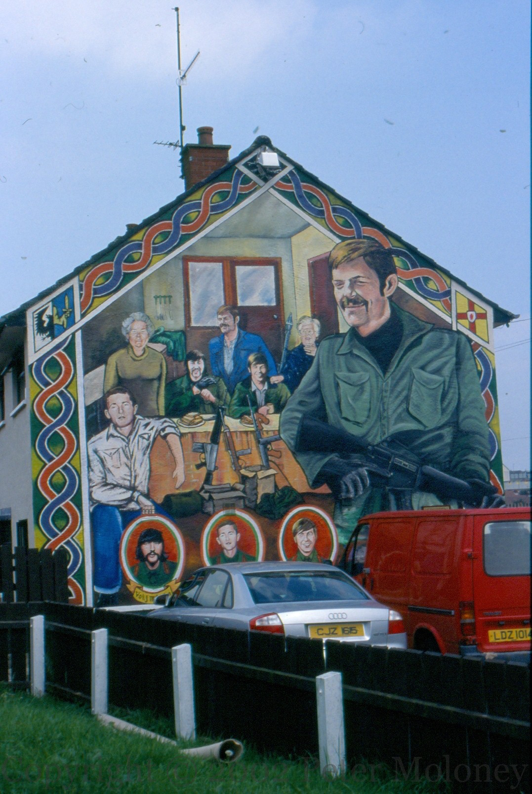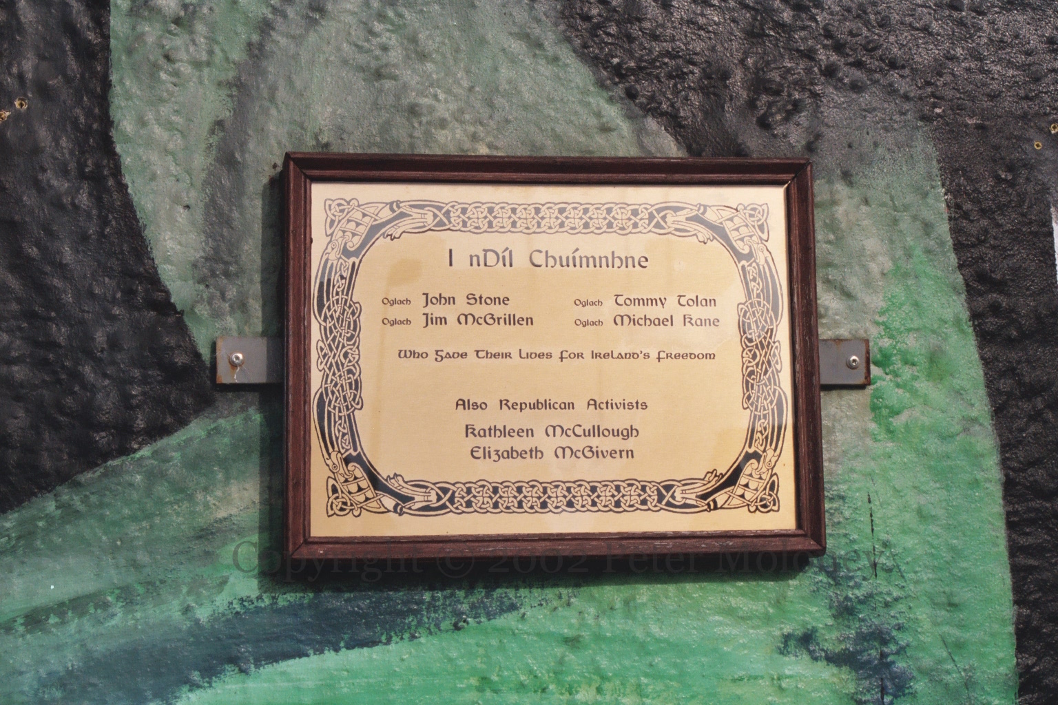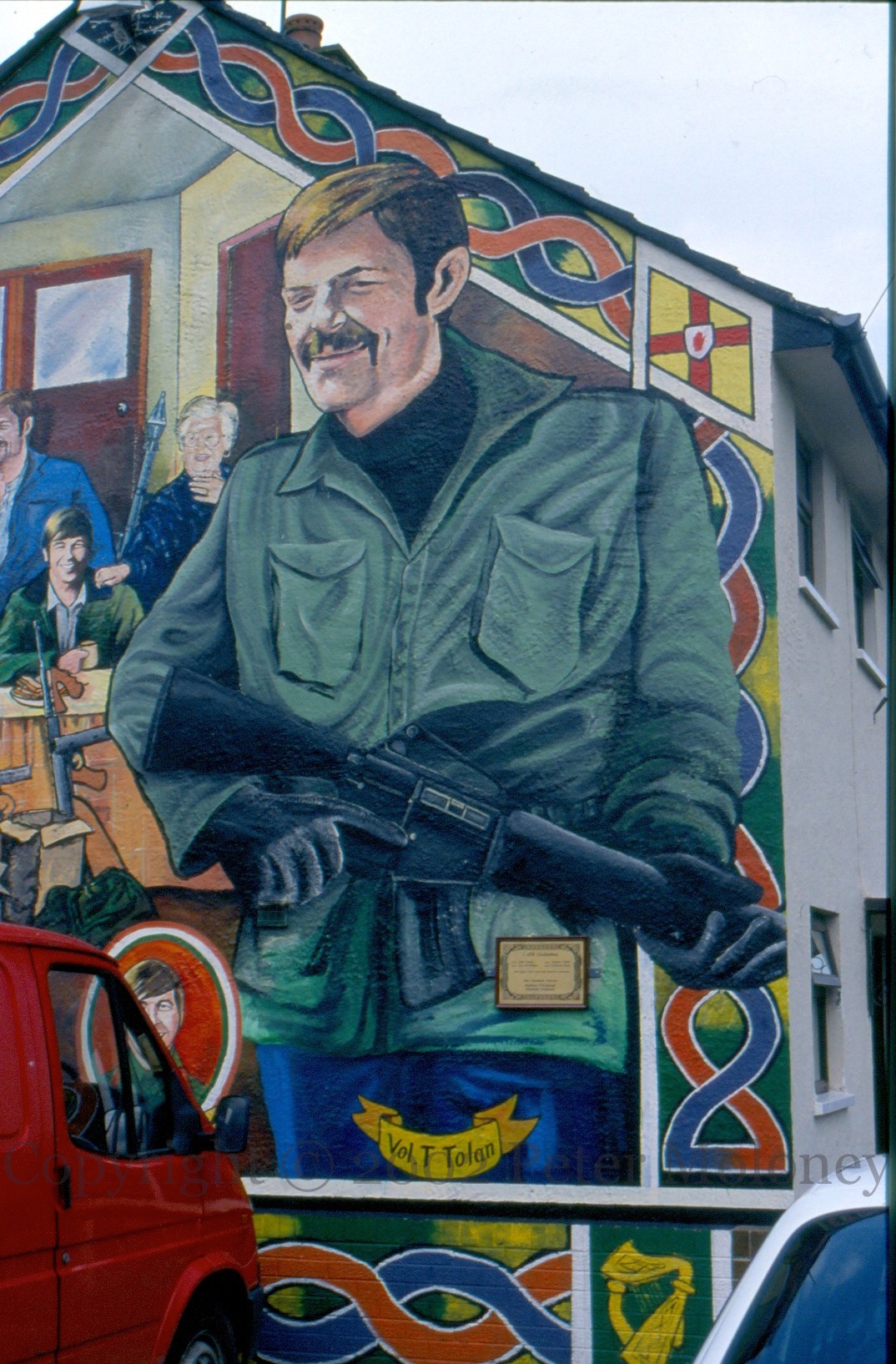 Four IRA volunteers “who gave their lives for Irish freedom”, John Stone, Jim McGrillen, Tommy Tolan, and Michael Kane, eat in the kitchen of a Ballymurphy house, perhaps belonging to one of the “republican activists Kathleen McCullough, Elizabeth McGovern.” The large image of Tolan would later be changed to show him in a brown suit and without the assault rifle – see X05055.