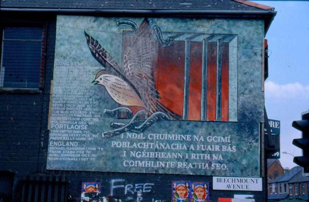 2002 image of the republican prisoners board in Beechmount Avenue, Belfast. In addition to the 1981 hunger strikers and Stagg and Gaughan, the mural mentions Paddy Joe Crawford, Francis Dodds, Patrick Teer, Teddy Campbell, Hugh Coney, Jim Moyne, Henry Henry, Sean Bateson, Pol Kinsella (all from Long Kesh), Tom Smyth, Brendan Seery, Paddy Kelly (Portlaoise), Noel Jenkinson and Sean O’Conaill (who died in English prisons).