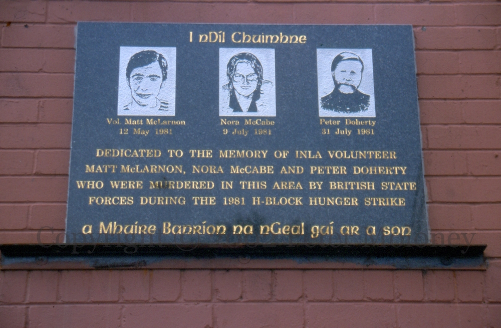 “Dedicated to the memory of INLA volunteer Matt McLarnon, Nora McCabe and Peter Doherty who were murdered in this area by British state forces during the 1981 H-Block hunger strike. A Mhuıre banríon na nGael guí ar a son”. The area in question is Clonard/Falls. Doherty and McCabe were hit by plastic bullets; McLarnon was shot by a sniper on Divis tower. Erected by a Sınn Féın group (Lower Falls/Clonard Committee) rather than INLA.