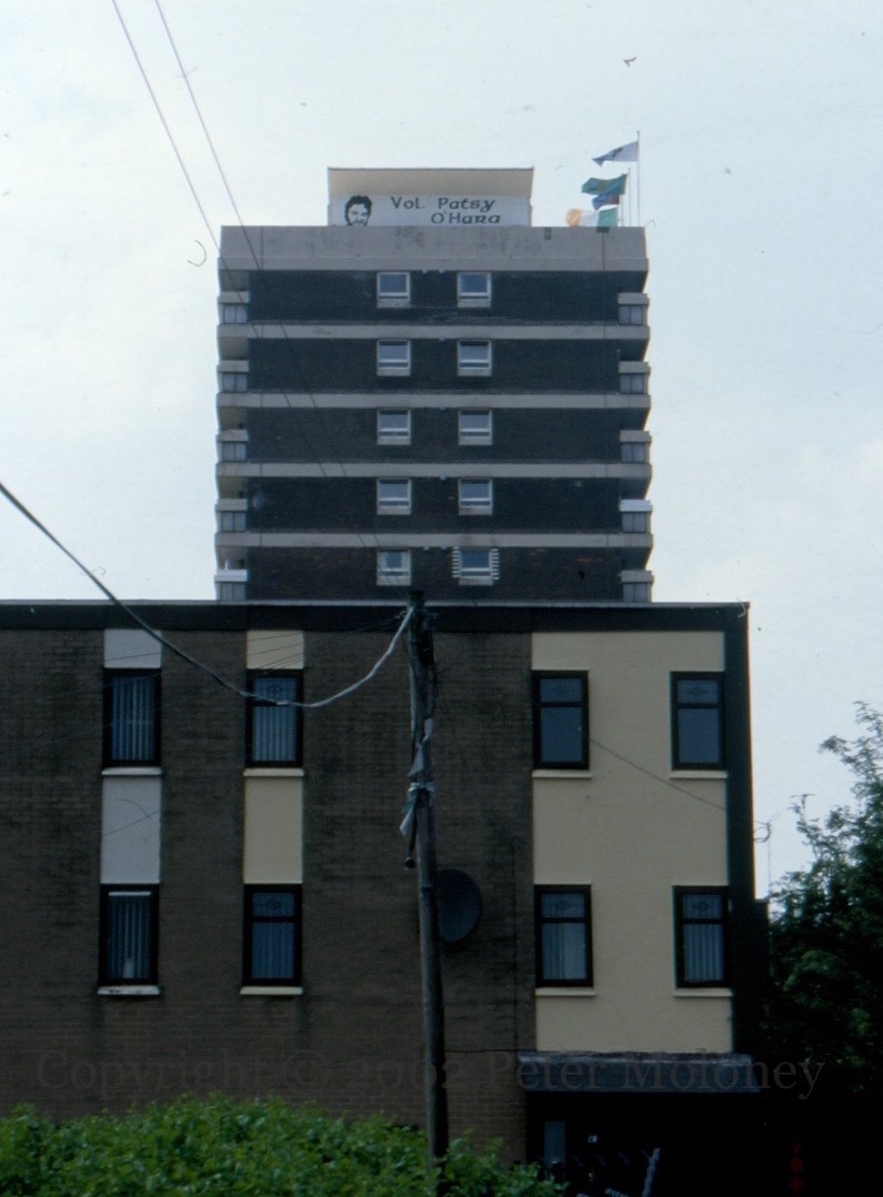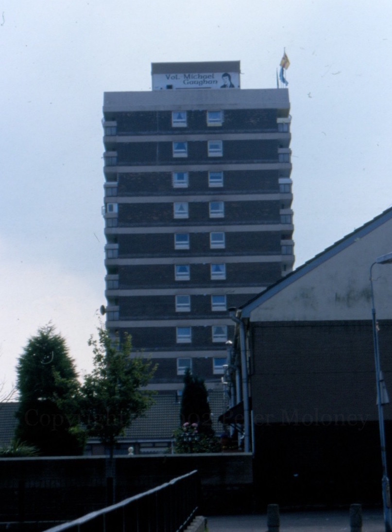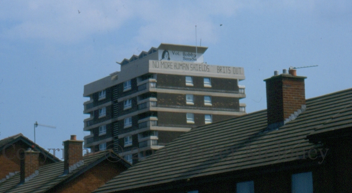 The names of portraits of the ten deceased 1981 hunger strikers, plus Frank Stagg and Michael Gaughan, are on six of the seven New Lodge “houses” (high-rise buildings), two per house. Other slogans have appeared just below them, such as the “No more human shields – Brits out” shown in the first image, below the portrait of Bobby Sands on Teach Eıthne (perhaps a reference to the Army positions on top of Teach Mhéabha (Maeve House) and Teach Gráınne?). There are some more images in the Seosamh Mac Coılle collection.
