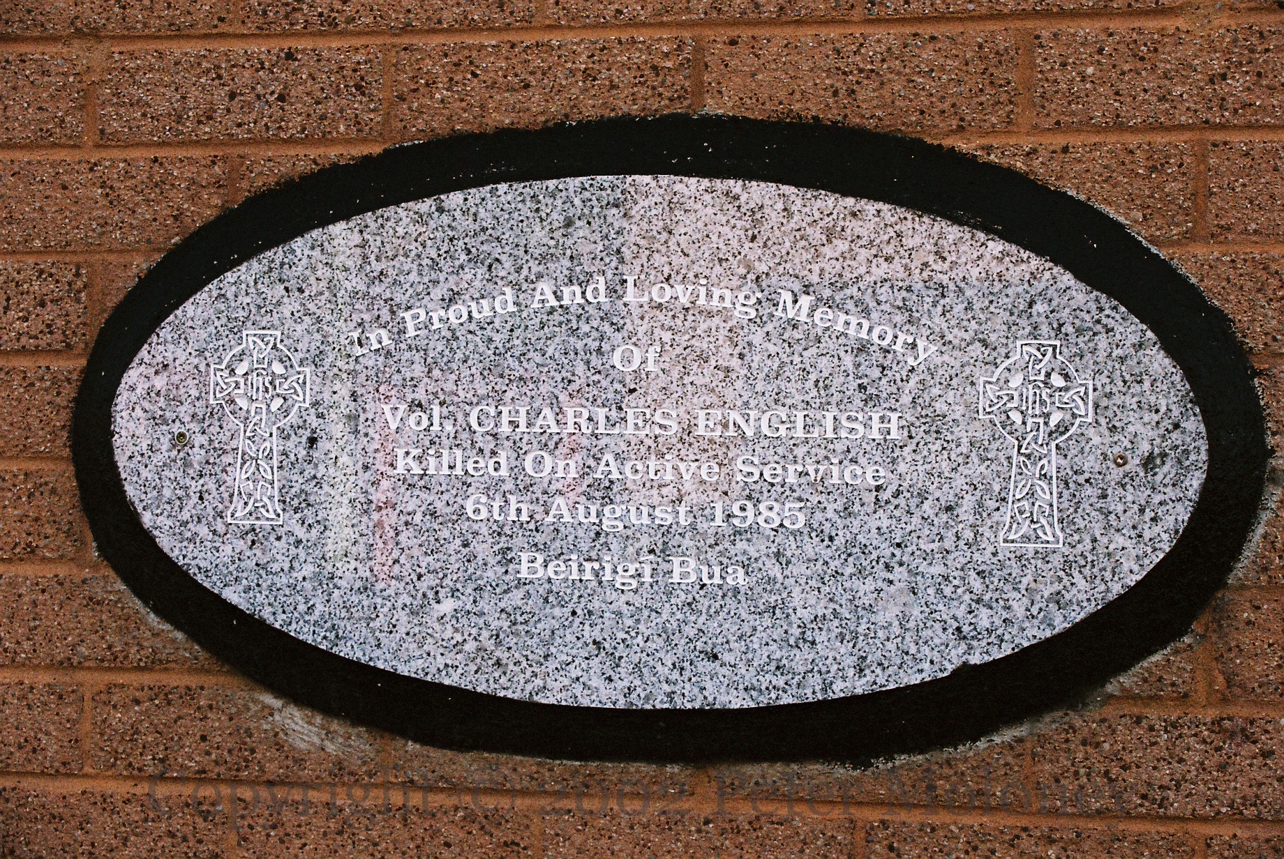 Volunteer Charles English was a member of the IRA’s Derry Brigade (1st battalion). He died on August 6th, 1985, at age 21, when a grenade launcher exploded. His brother, Gary, had been killed four years earlier when an Army land rover hit and then reversed over him (Derry Journal). Images from the funeral are collected in this video.
