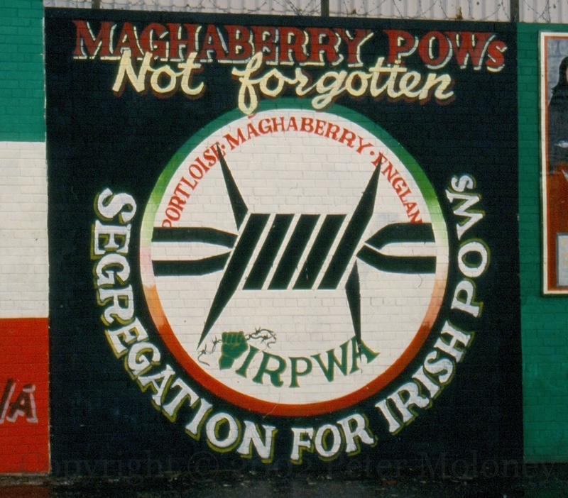 This is the first full mural from the IRPWA in the Collection (after a 2001 flag in Derry and some 2002 writing in Belfast). It calls for segregation in Portlaoise, Maghaberry, and English jails.