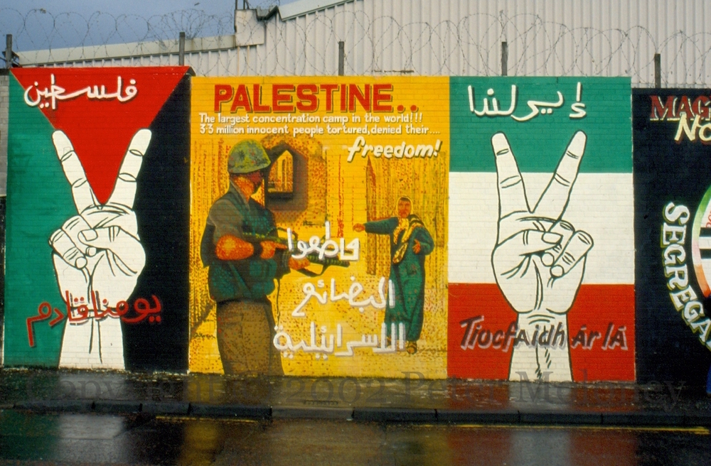 “Palestine … the largest concentration camp in the world!!! 3.3 million innocent people tortured, denied their freedom!” Flanked on each side by a hand giving the V-for-Victory sign, on Palestinian and Irish flags.