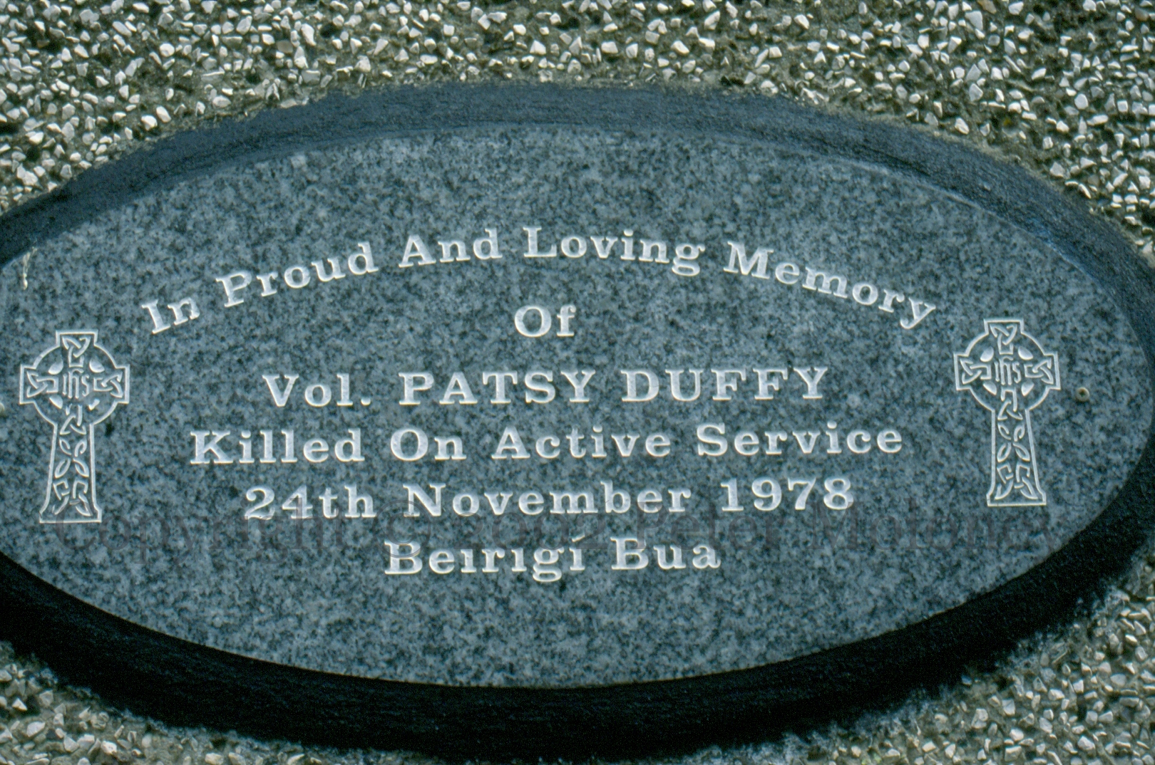 Patsy Duffy 2002-04-182025-02-26Extramural Activity IRA volunteer Patsy Duffy was shot by undercover British Army soldiers at an arms cache in Maureen Avenue, Derry, near the spot of this plaque in his memory. Click image to enlargeCopyright © 2002 Peter MoloneyM01777 [M02166] Share this: Click to share on X (Opens in new window) X Click to share on Facebook (Opens in new window) Facebook Like Loading... Related