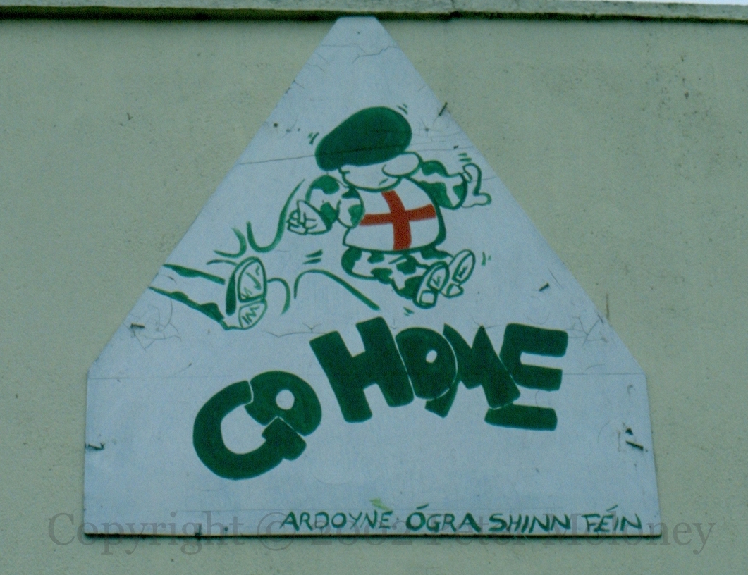Go Home 2002-04-202025-02-26Extramural Activity A cartoon British soldier (in the style of Cormac) is given the boot. Sponsored by “Ardoyne Ógra Shınn Féın”. Brompton Park, north Belfast Click image to enlargeCopyright © 2002 Peter MoloneyM01780 Share this: Share on X (Opens in new window) X Share on Facebook (Opens in new window) Facebook Like Loading... Related