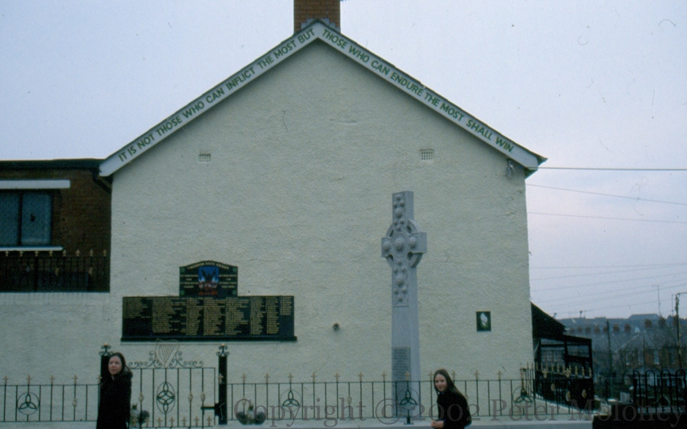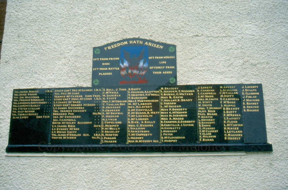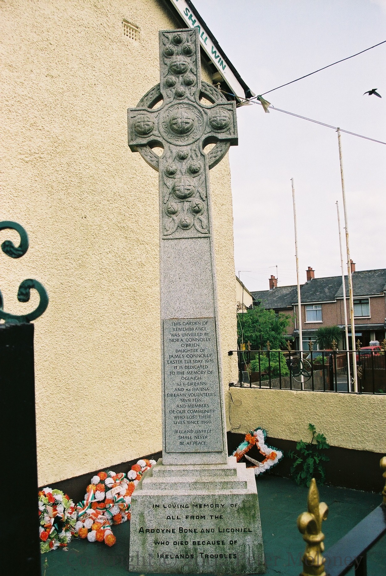 “It is not those who can inflict the most but those who can endure the most shall win [who will conquer].” (Terence MacSwiney). Those “from the Ardoyne, Bone, and Ligoniel who died because of Ireland’s troubles” are commemorated on the Celtic cross (which dates back to 1976). The plaque (dating at least to 1993) reads “Oft from prison bars, oft from battle flashes/Oft from heroes’ lip, oftenest from their ashes.” and includes names of deceased IRA and Sınn Féın members killed up to 1972, and civilian locals.