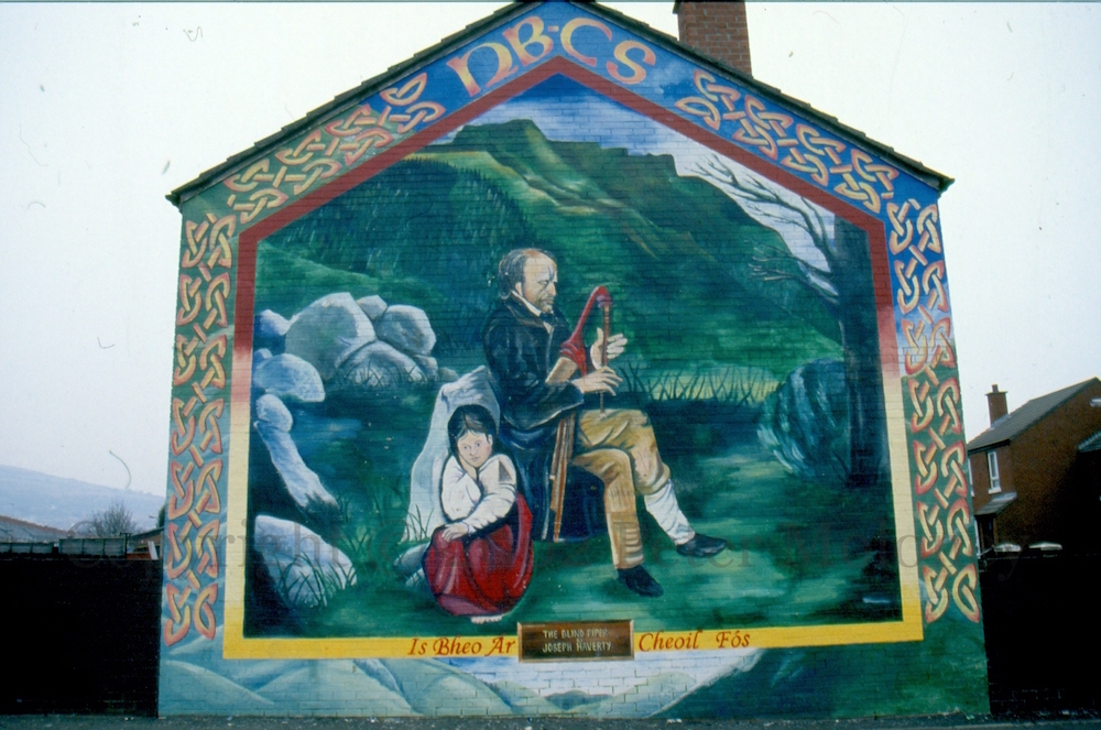 “Is bheo ár cheoıl [gceoıl] fós” [Our music lives still]. The Blind Piper is a painting (original) by Joseph Haverty (WP), here placed in the context of north Belfast’s Cave Hill. Sponsored by North Belfast Cultural Society.