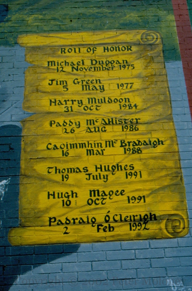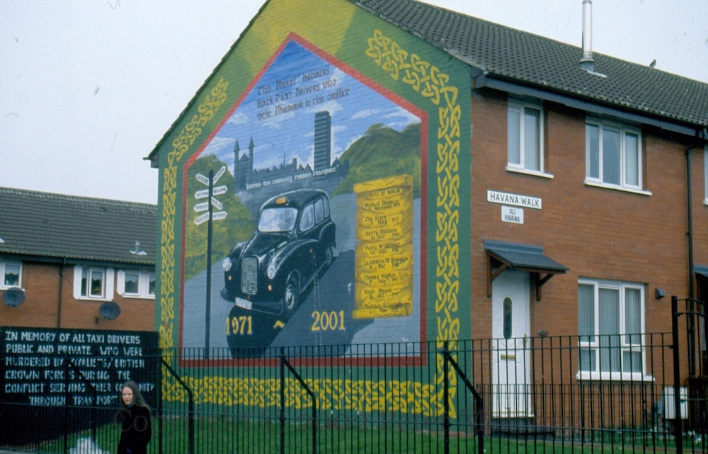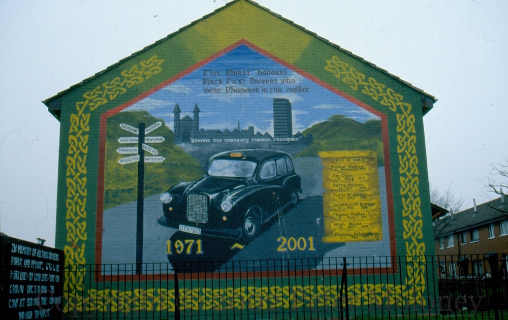 “This mural honours black taxi drivers who were murdered in this conflict”, including the eight named in the ‘roll of honour’ on the right: Michael Duggan, Jim Green, Harry Muldoon, Paddy McAllister, Caoımmhın [sic] McBradaıgh (killed at Milltown), Thomas Hughes, Hugh Magee, Padraıg Ó Cleırigh. “In memory of all taxi drivers, public and private, who were murdered by loyalist/British crown forces during the conflict serving their community through transport.”