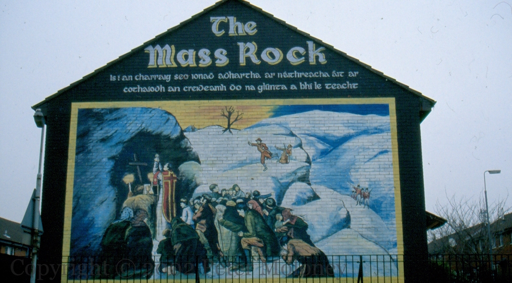 This mural commemorates the repression of Catholicism and use of mass rocks as secret locations in the days of the penal laws, c. 1650-1800 under and after Cromwell.