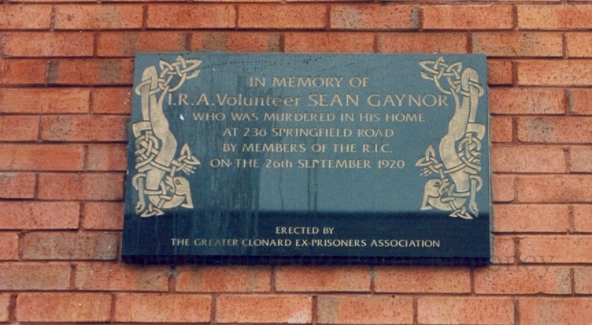 “In memory of IRA Volunteer Sean Gaynor who was murdered in his home at 236 Springfield Road by members of the RIC on the 26th September 1920. Erected by the greater Clonard ex-prisoners association.” Gaynor was one of three victims of an RIC murder gang that night (See ROM’s account.)