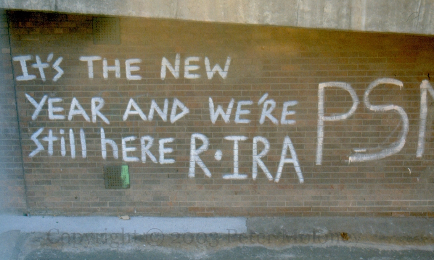 We’re Still Here 2003-01-082025-02-27Extramural Activity “It’s the new year and we’re still here – RIRA [Real IRA]”. Lecky Road, Derry Click image to enlargeCopyright © 2003 Peter MoloneyM01920 Share this: Click to share on X (Opens in new window) X Click to share on Facebook (Opens in new window) Facebook Like Loading... Related