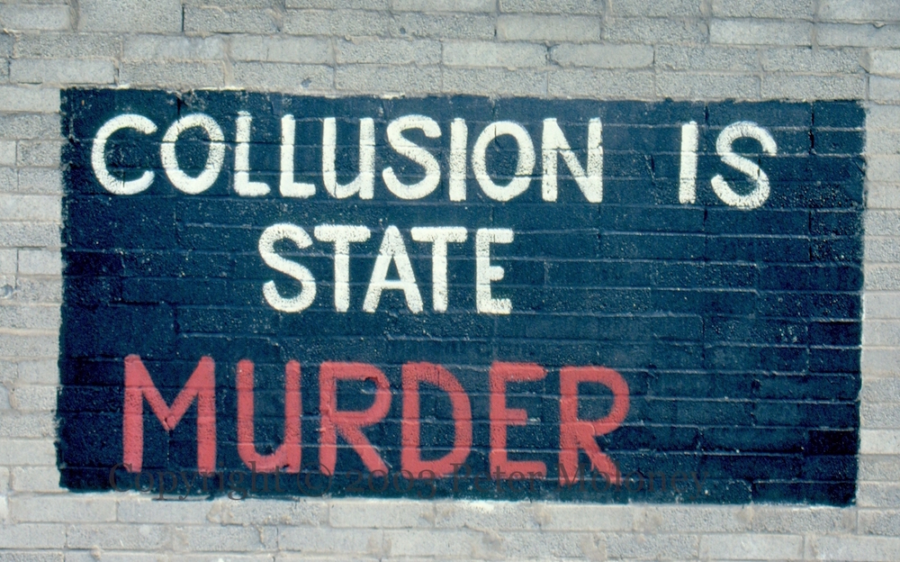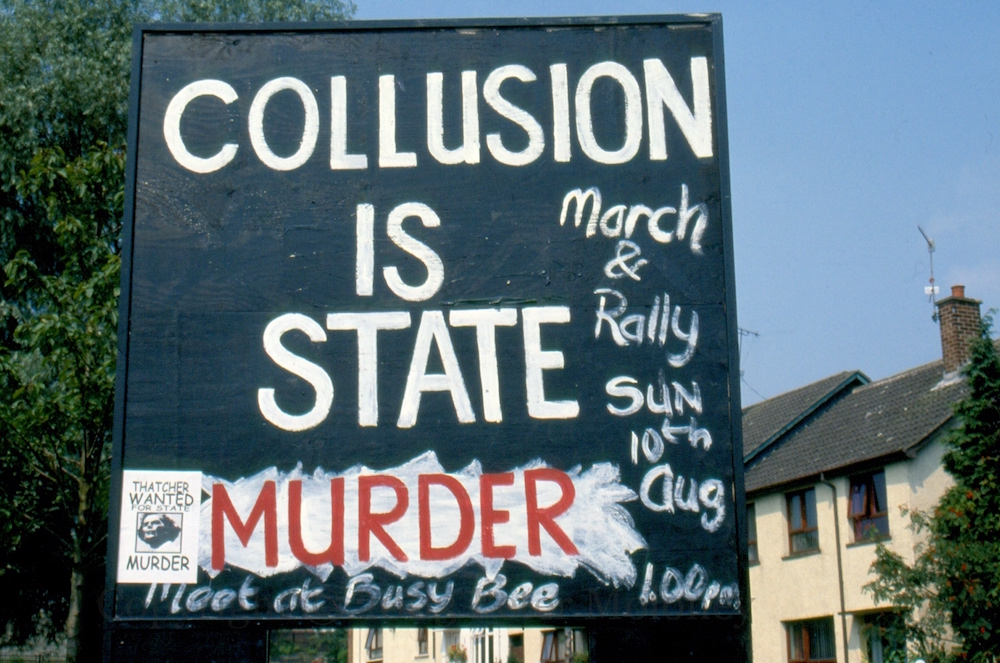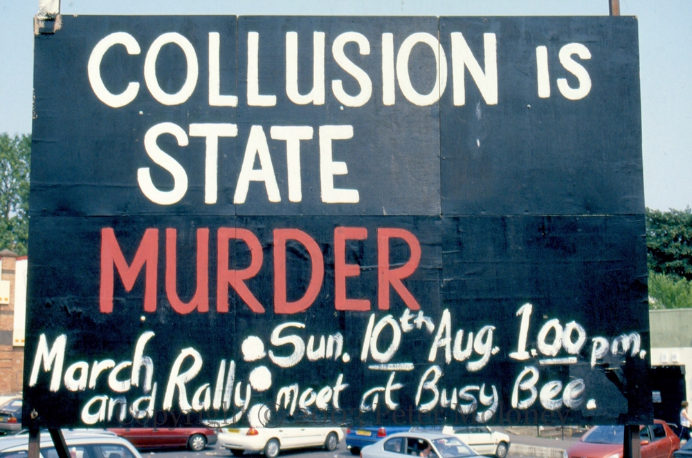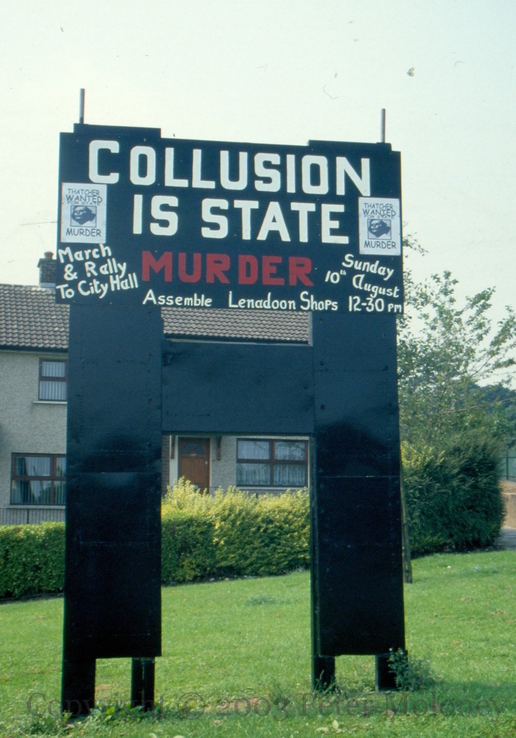 Here are four boards/murals (from Glen Road, Andersonstown Road, Andersonstown Road, and Shaws Road) calling people to a march and rally against collusion on August 10th, 2003. Two include a vintage poster of Margaret “Thatcher – wanted for state murder.”
