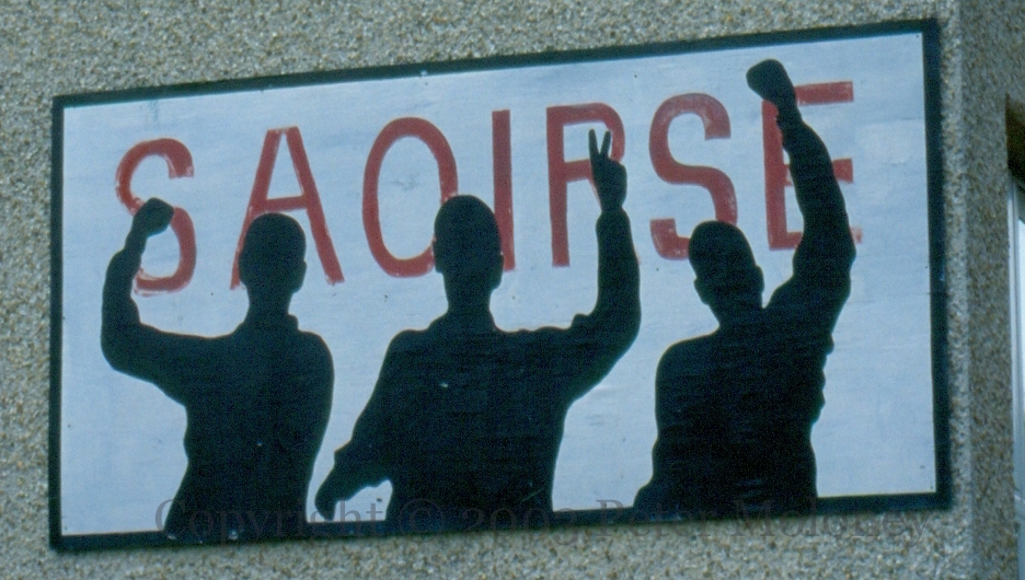 Saoırse 2003-01-192025-02-27Extramural Activity Silhouetted figures with raised fists and flashing the victory sign protest for saoırse (freedom). Lenadoon Avenue, west Belfast Click image to enlargeCopyright © 2003 Peter MoloneyM01940 Share this: Share on X (Opens in new window) X Share on Facebook (Opens in new window) Facebook Like Loading... Related