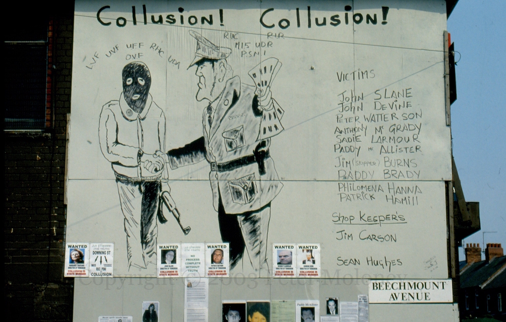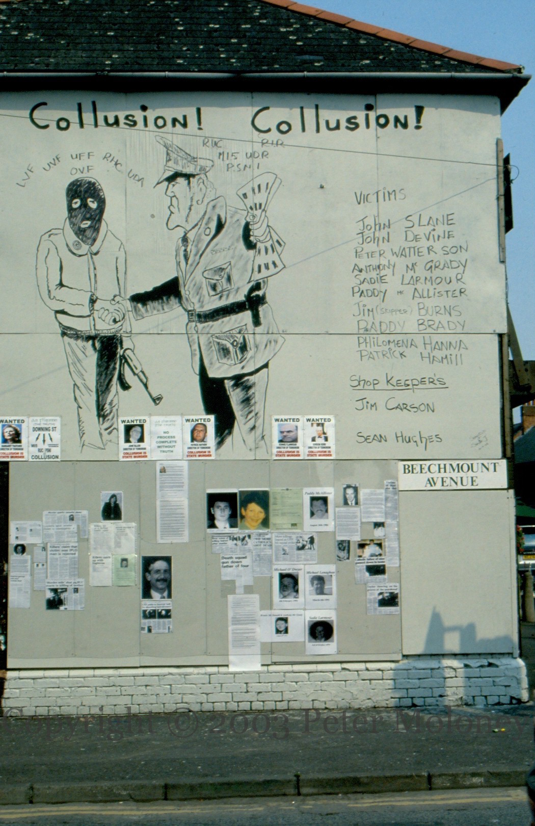 Added to the drawing of collusion between security forces and loyalist paramilitaries are portraits and news reports of its victims: John Slane, John Devine, Peter Watterson, Anthony McGrady, Sadie Larmour, Paddy McAllister, Jim ‘Skipper’ Burns, Paddy BRady, Philomena Hanna, Patrick Hamill, and shopkeepers Jim Carson and Sean Hughes.