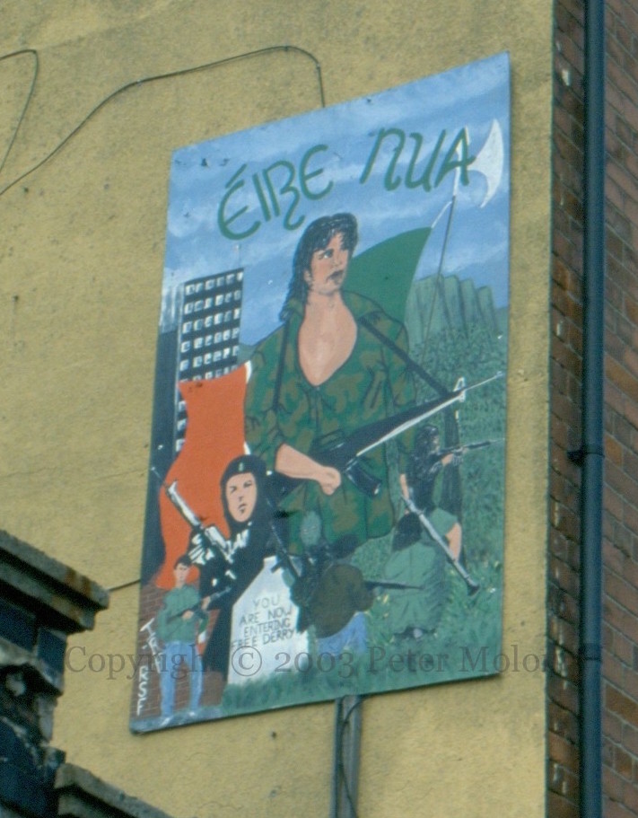 The board above combines various iconic images: Divis tower, Cave Hill, Free Derry Corner, the female volunteer in beret, the revolutionary in front of the Tricolour on a pike.