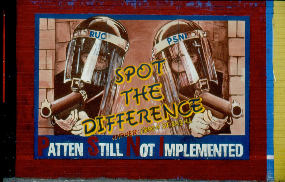 The commission into policing led by Conservative MP Chris Patten produced its report in September 1999 and various of its recommendations were enacted into law. (The full report or the summary of recommendations are available at CAIN.) The board above alleges that the only change was the name – the name originally suggested was “Northern Ireland Police Service”, but “PSNI” was thought a better initialism – while both forces continue to use plastic bullets. The officer on the right has six digits on his right hand.
