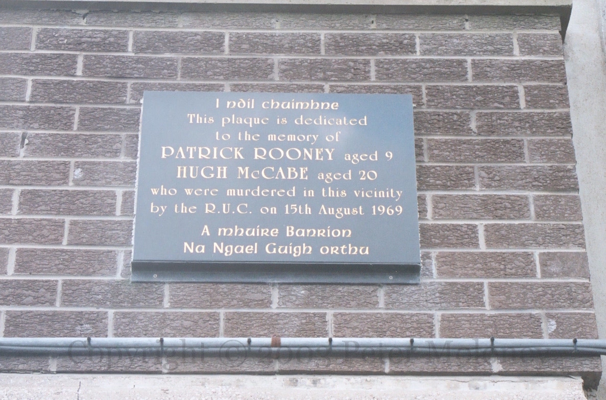 The Troubles in Belfast started in August 1969 with sustained rioting around Divis flats. On the night of August 14-15, nine year-old Patrick Rooney was hit in his home in the Divis flats by a bullet from an RUC machine-gun; he was the first child killed in the Troubles. A little later, 20 year-old Hugh McCabe, a (Catholic) British soldier on leave, was hit while dragging an injured person to safety on the roof of another flat (WP).
