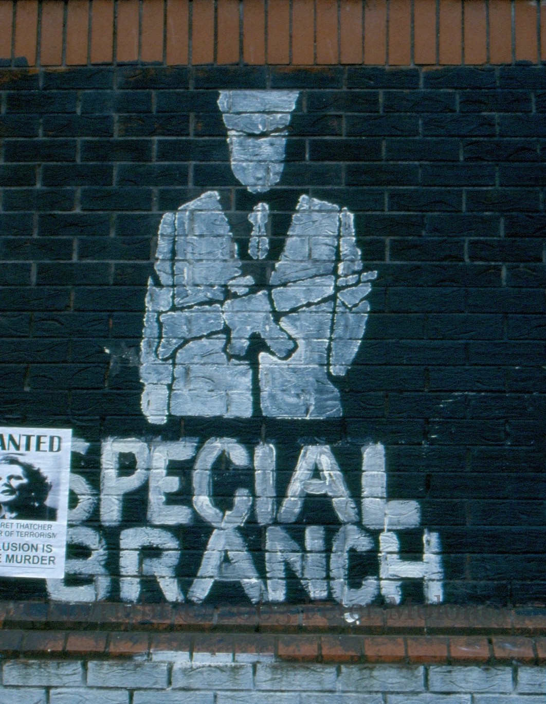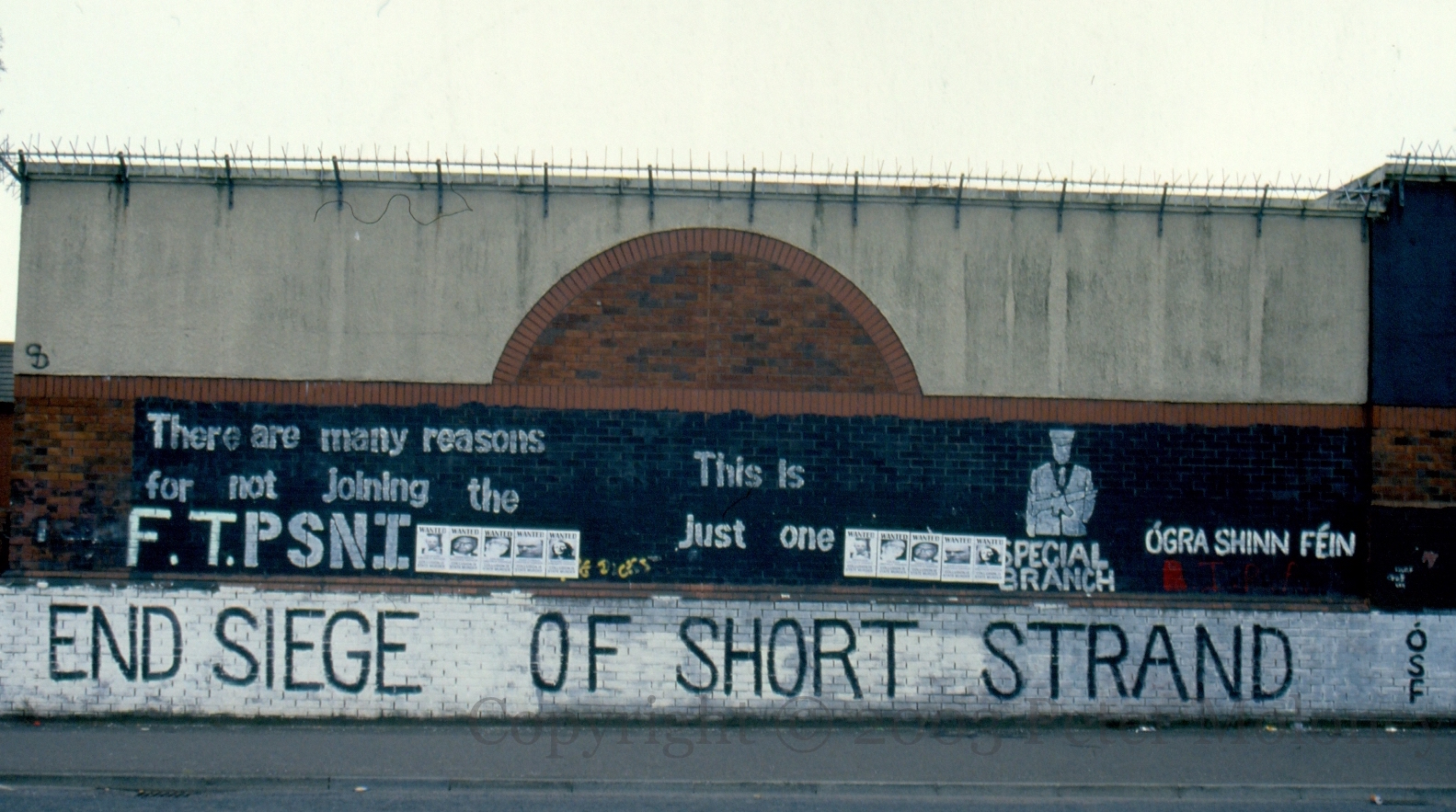 Short Strand is a Catholic enclave of about 1,000 people in Protestant east Belfast. Throughout 2001 and 2002, the interface saw gun battles and rioting between the two factions. Here is a Guardian account of events in 2002. Above is a rejection of the new PSNI “There are many reasons for not joining the PSNI – this is just one” with a series of wanted posters (seen Collusion! Collusion! and Collusion Is State Murder plus one of Patrick Mayhew). Both parts by Ógra Shınn Féın. Divis Street, Belfast.