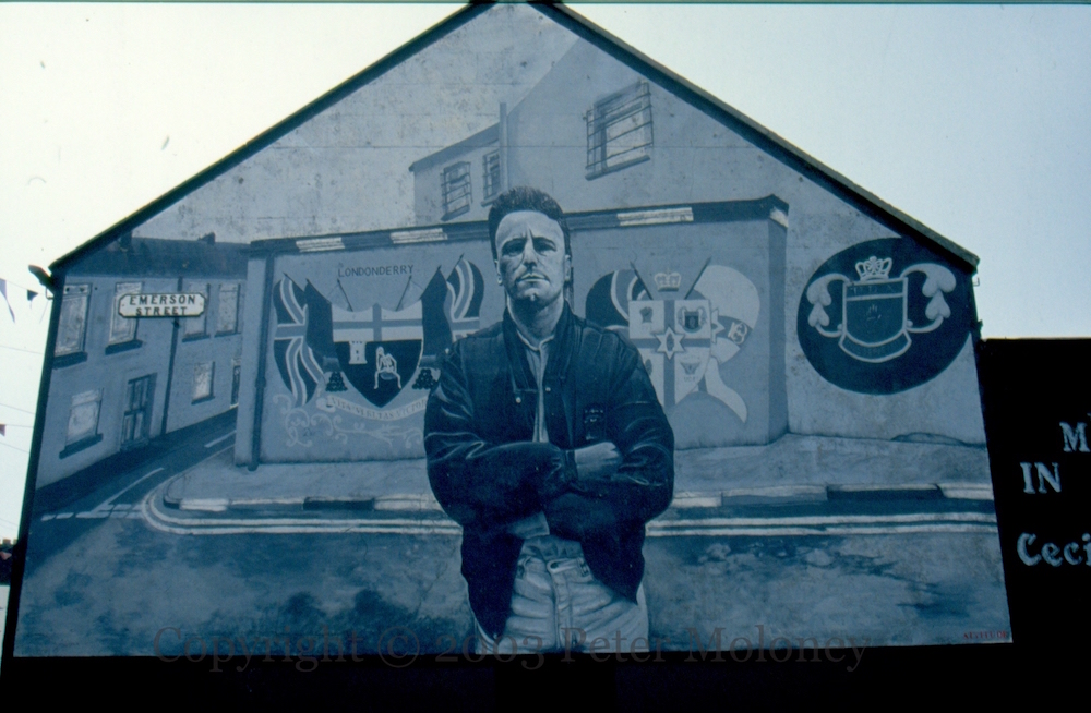 Cecil McKnight was a UDA/UFF volunteer, Orange Order member, and chairman of the UDP (Ulster Democratic Party) when he was shot dead at his home in Melrose Terrace by the IRA on June 29th, 1991. (Sentinel). McKnight is shown standing in front of a mural in the adjacent Ebrington Terrace circa 1990.