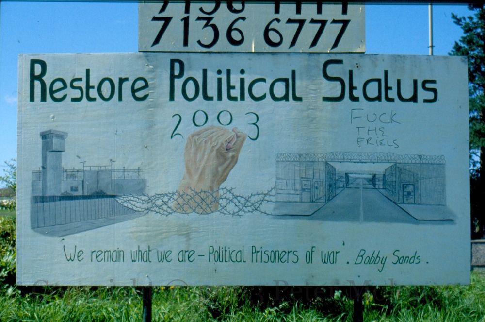 “We remain what we are – political prisoners of war.” The words of 1981 hunger striker Bobby Sands are used in support of contemporary (2003) republican prisoners. Long Kesh is on the left, Maghaberry is on the right.
