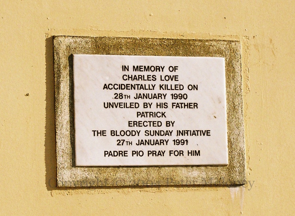 The memorial plaque to Charles (Charlie) Love was originally mounted in 1991 and preserved when the flats at the junction of Fahan Street and Rossville Street, Derry, were re-done. (The Runner would later be painted around it by the Bogside Artists.) “In memory of Charles Love, accidentally killed on 28th January 1990. Unveiled by his father Patrick. Erected by the Bloody Sunday Initiative 27th January 1991. Padre Pio pray for him.” Love was 17 years old when he was hit by flying masonry from an IRA bomb while attending a Bloody Sunday memorial.