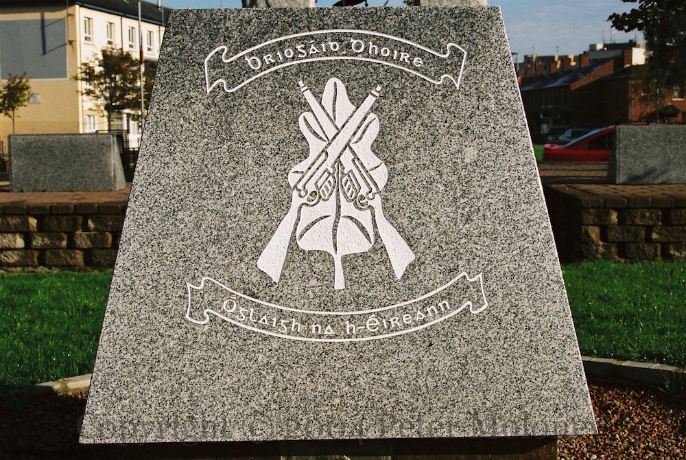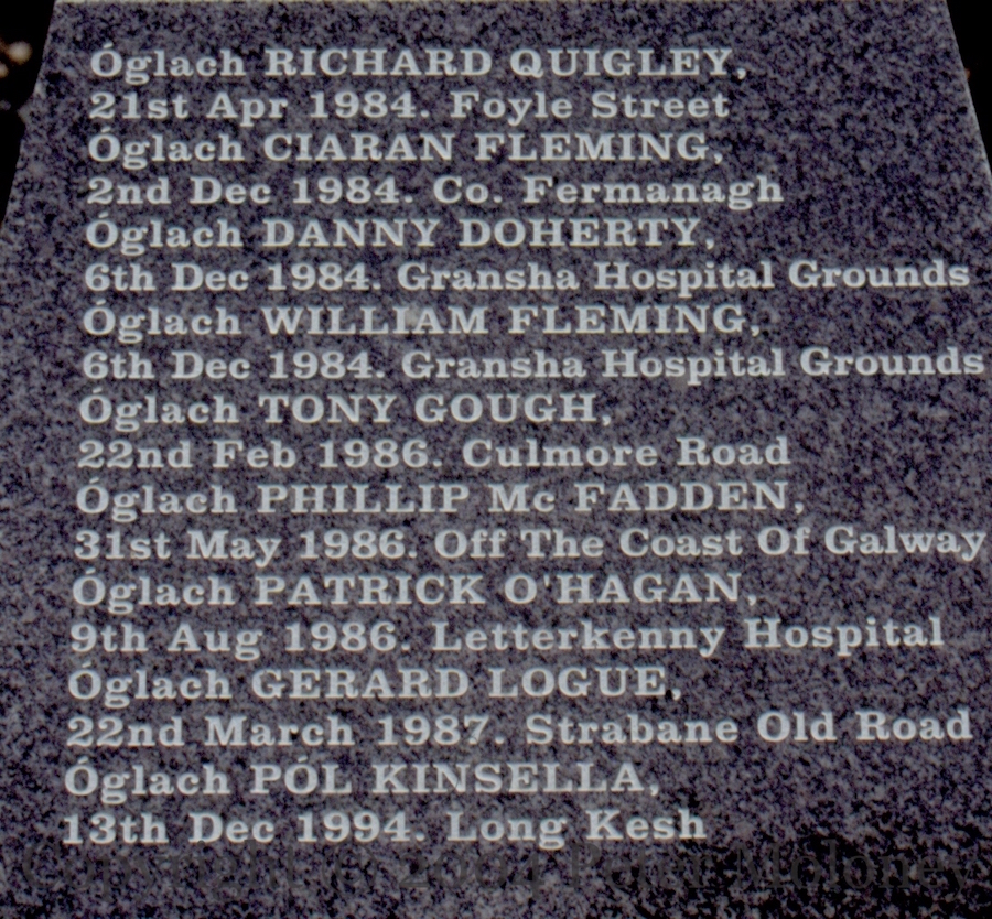 “Ar fud na ceathrach seo, tá gluaıseacht na poblachta tar éıs na haıteacha mar a bhfuaır Óglach na hÉıreann bás ar fıanas a mharcáıl le leaca cuımhneacháın. Tá an leac seo toırbhrıthe do na hÓglaıgh sıúd a fuaır bás ın áıteacha nach bhfuıl fóırsteanach do thógáıl leıca cuımhneachaın. Arna thógáıl a gcomrádaıthe ı nGluaıseacht na poblachta. 12ú Deıreadh Fómhaır 2003. Beırıgí bua.”