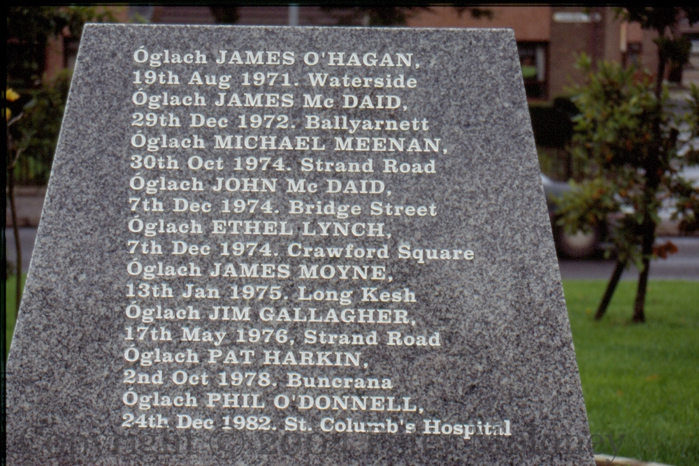 Many memorial plaques to IRA volunteers have been featured previously on this site: Michael Quigley | Brian Coyle | Patsy Duffy | Dennis Heaney | John Starrs | Charles English | Seamus Bradley | Sean Dolan | George McBrearty & Pop Maguire (see also Bronco Bradley). The Derry Brigade memorial in the median between Fahan Street and Rossville Street “is dedicated to those Volunteers who died in places where circumstances do not permit the erection of a commemorative plaque.” There are 18 names on the stone. Vintage rifles are crossed in front of an oak leaf, symbol of the city of Derry.