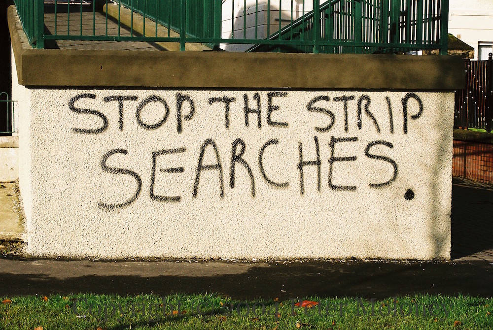 Stop The Strip Searches 2004-01-082025-02-27Extramural Activity Republican graffiti protesting treatment of prisoners in Maghaberry, off Rossville Street, Derry. Click image to enlargeCopyright © 2004 Peter MoloneyM02141 Share this: Click to share on X (Opens in new window) X Click to share on Facebook (Opens in new window) Facebook Like Loading... Related