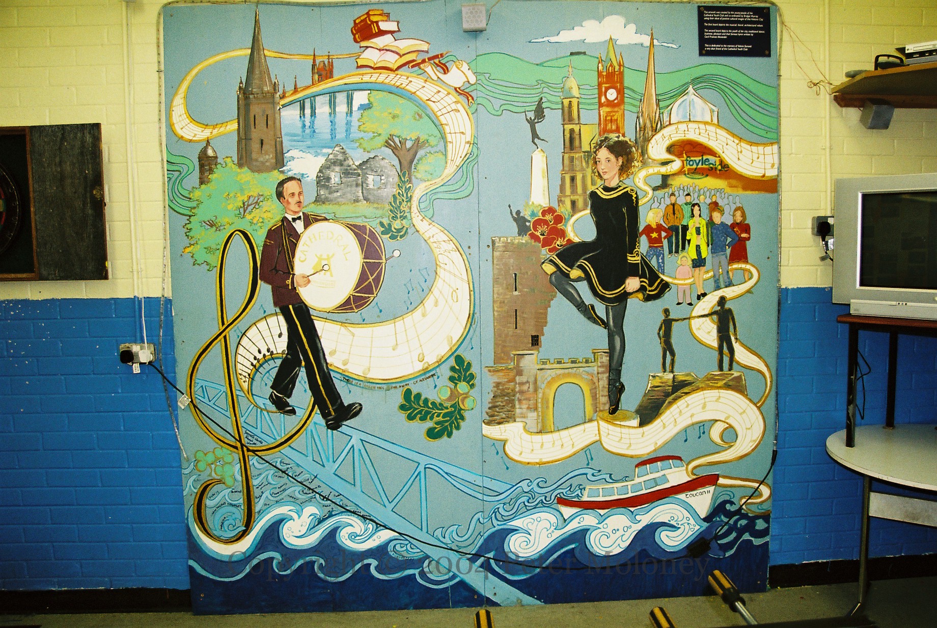 This cross-cultural mural from inside the Cathedral Youth Club, in the Fountain, Londonderry, celebrates both the music of flute-and-drum bands and Irish dancing. The tune illustrated ‘There Is A Green Hill Far Away’ by Cecil Alexander, wife of Church Of Ireland bishop William Alexander. They lived in Strabane and the eponymous hill is said to be one outside the old walls of Derry.