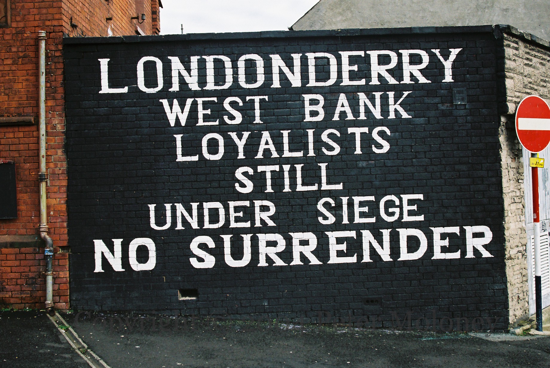 The ‘still under siege’ message from “West Bank loyalists” in Hawkin Street, Londonderry, is repaired after being paint bombed – see 2002 image. “No surrender.”