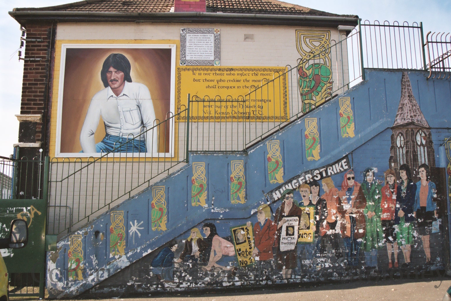 Kieran Doherty was elected TD (Teachta Dála) for Cavan-Monaghan three weeks into his 1981 hunger strike. He held the position for two months, until he died on August 2nd. The portraits, plaques, and mural of marchers are in his home area of Andersonstown. The words “It is not those who inflict the most, but those that can endure who shall conquer in the end” are an echo of Terence MacSwiney, whose hunger strike in 1920 lasted 74 days, one more than Doherty’s.